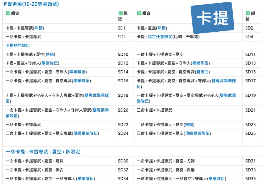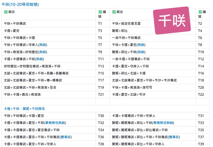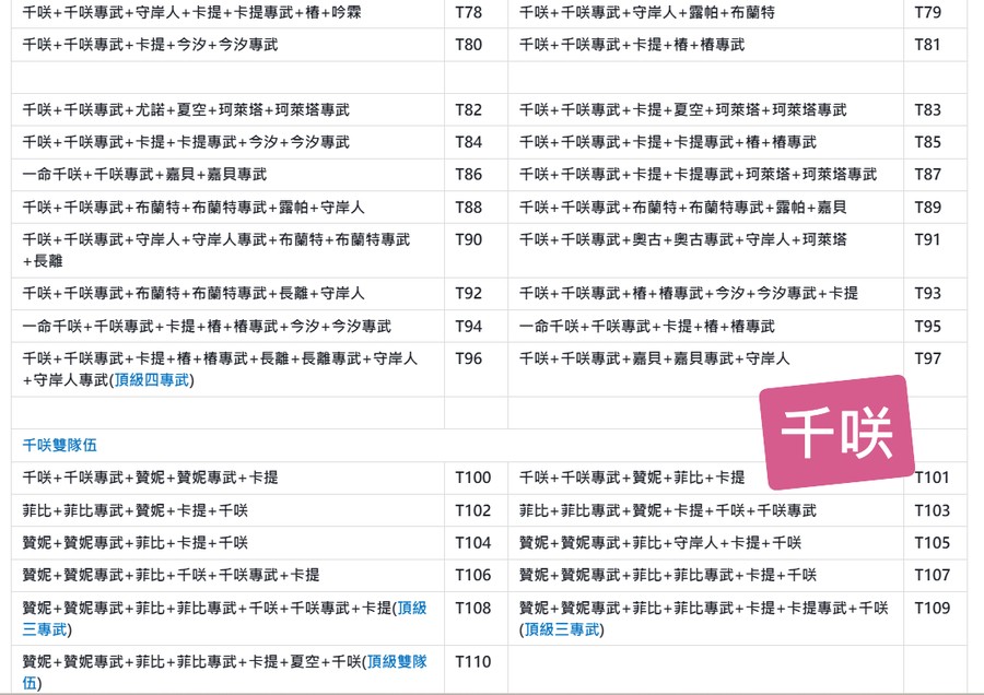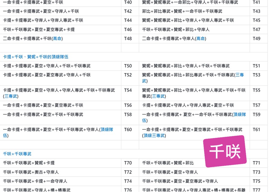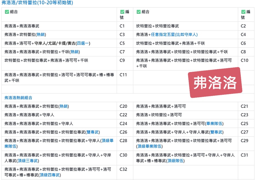 | A30 | 二命卡提+卡提專武+夏空+奧古+奧古專武 | A31 | 二命卡提+卡提專武+夏空+千咲+弗洛洛+弗洛洛專武+洛可可+守岸人(頂級畢業隊伍) |
