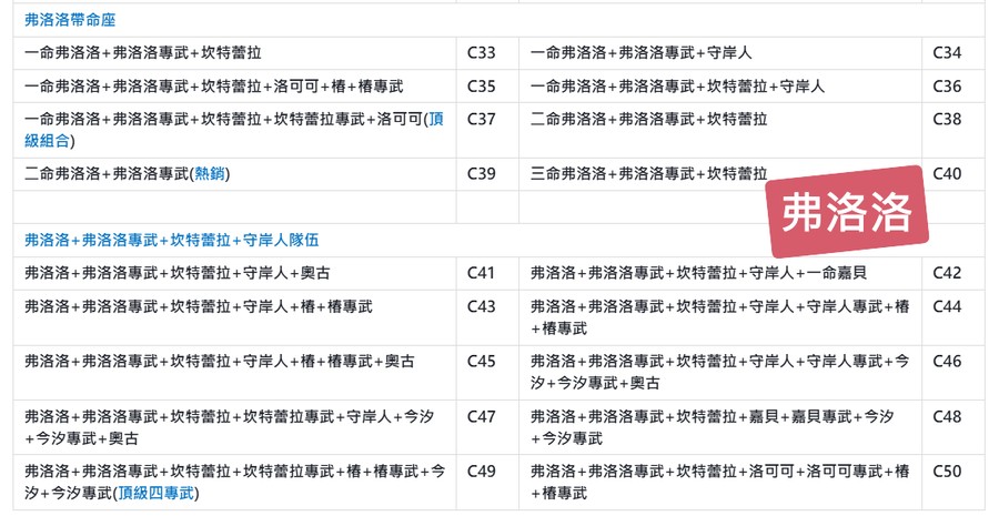 | A74 | 一命弗洛洛+弗洛洛專武+坎特蕾拉+坎特蕾拉專武+千咲+千咲專武+嘉貝+嘉貝專武+仇遠+仇遠專武(頂級組合A) | A75 | 弗洛洛+弗洛洛專武+洛可可+守岸人+千咲+千咲專武 |
