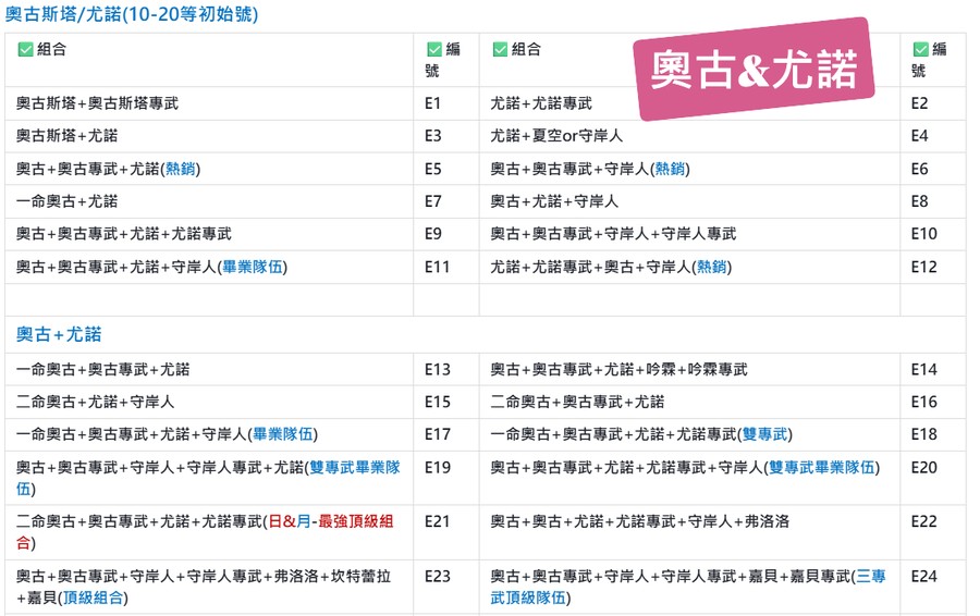 | A94 | 奧古+尤諾+尤諾專武+守岸人+守岸人專武+夏空+贊妮+贊妮專武 | A95 | 二命奧古+奧古專武+尤諾+尤諾專武+守岸人(畢業隊伍) |