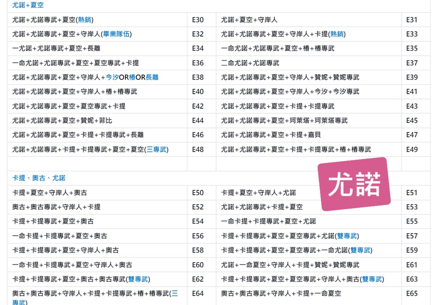 | A98 | 奧古+奧古專武+尤諾+尤諾專武+嘉貝+嘉貝專武+露帕+露帕專武(四專武) | A99 | 三命尤諾+尤諾專武+夏空+夏空專武+守岸人 |