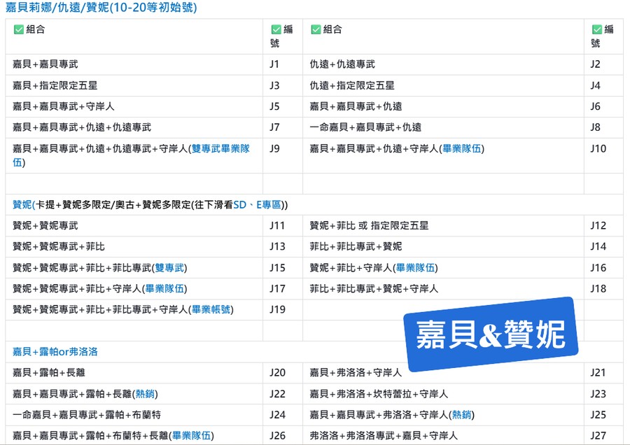 | A124 | 嘉貝+嘉貝專武+仇遠+仇遠專武+守岸人+11000-15000-27000石頭(頂級畢業隊伍) | A125 | 嘉貝+嘉貝專武+仇遠+仇遠專武+15000-18000石頭 |