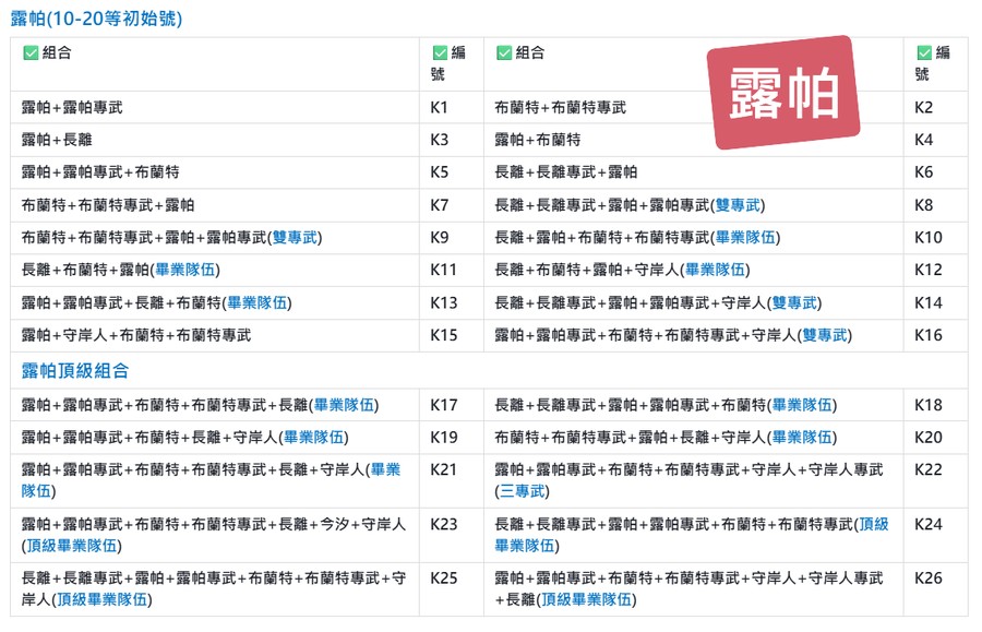 | 露帕+守岸人+布蘭特+布蘭特專武 | K15 | 露帕+露帕專武+布蘭特+布蘭特專武+守岸人(雙專武) | K16 |