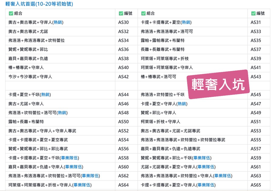 | A24 | 卡提+卡提專武+嘉貝+嘉貝專武+尤諾+尤諾專武+守岸人+守岸人專武(頂級組合) | A25 | 卡提+夏空+夏空專武+34000-43000石頭 |