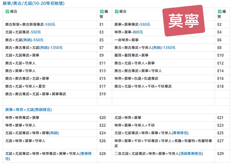 | A42 | 琳奈+琳奈專武+莫寧+24000-30000-40000-50000石頭(熱銷) | A43 | 琳奈+琳奈專武+莫寧+莫寧專武+15000-20000-25000石頭(熱銷) |