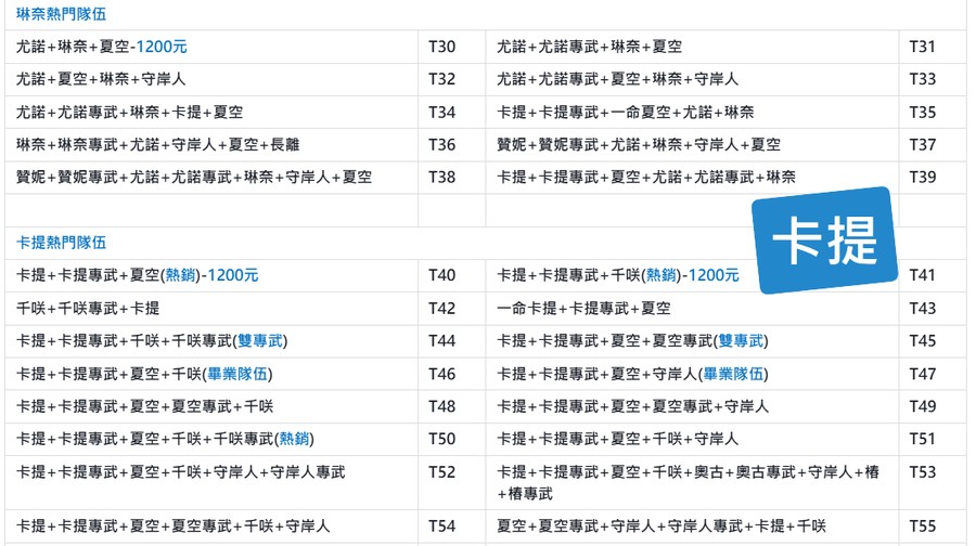 | A52 | 二命卡提+卡提專武+夏空+千咲+千咲專武(頂級組合) | A53 | 卡提+卡提專武+夏空+一命千咲+專武+18000石頭 |