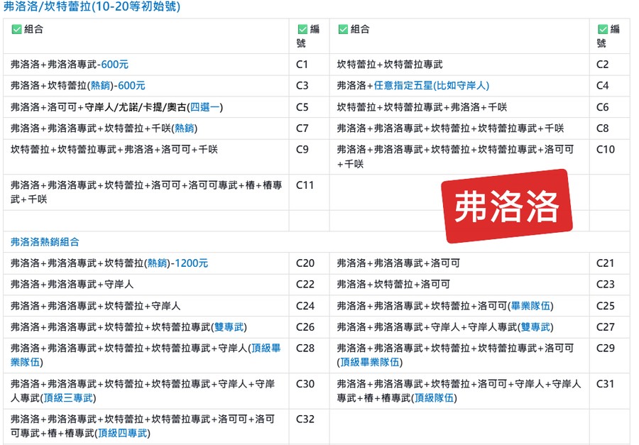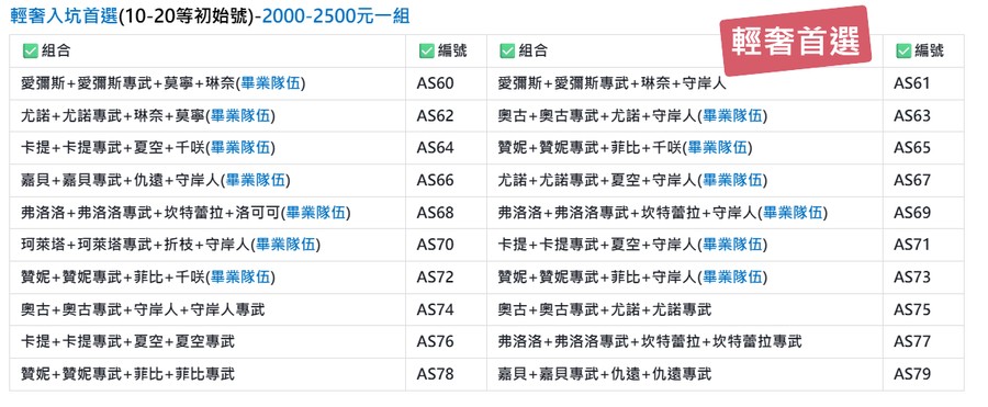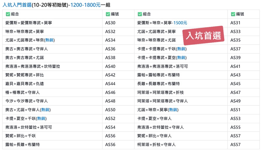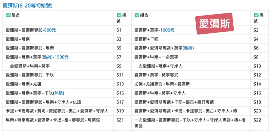 | ✅編號/價格 | ✅組合 | ✅編號/價格 | ✅組合 |