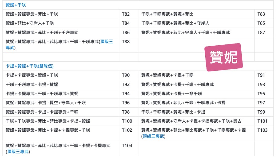 | 菲比+菲比專武+贊妮+贊妮專武+守岸人+卡提+卡提專武(畢業隊伍) | F11 | 菲比+菲比專武+贊妮+贊妮專武+守岸人+卡提(畢業隊伍) | F12 |