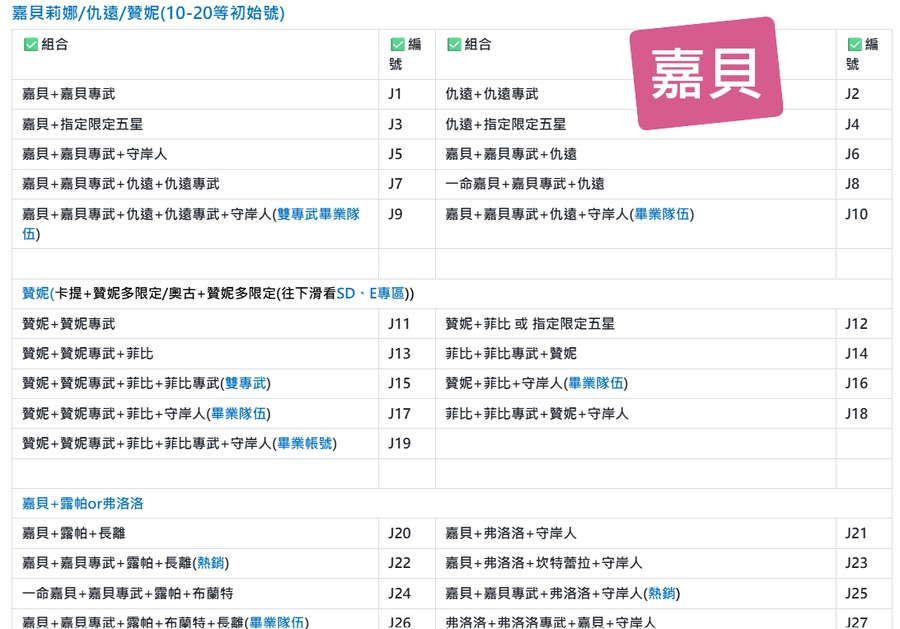| A70 | 嘉貝+嘉貝專武+仇遠+守岸人+15000-17000-25000-35000石頭 | A71 | 嘉貝+嘉貝專武+仇遠+仇遠專武+守岸人+15000-21000-27000石頭(頂級畢業隊伍) |