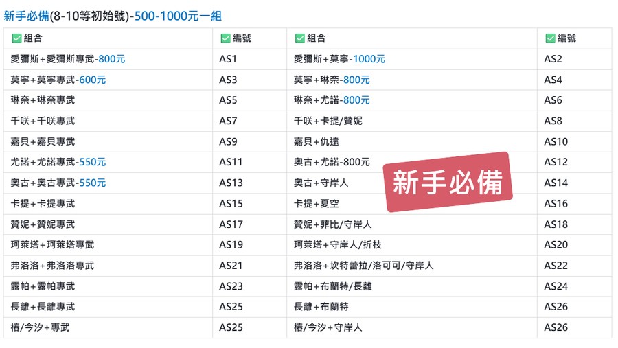 新手必備(8-10等初始號)-500-1000元一組
