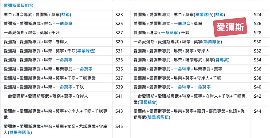 | 愛彌斯+愛彌斯專武+莫寧+琳奈(畢業隊伍) | AS60 | 愛彌斯+愛彌斯專武+琳奈+守岸人 | AS61 |