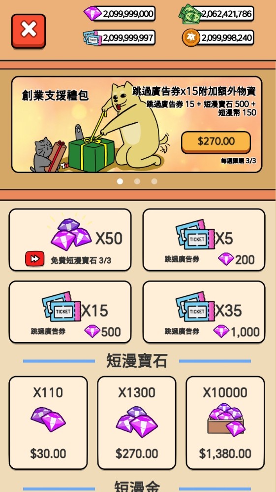 🔥 爽玩全包套餐方案 (鈔票 21億 + 鑽石 21億 + 短漫幣 21億 + 廣告跳過券 21億)|﹩500