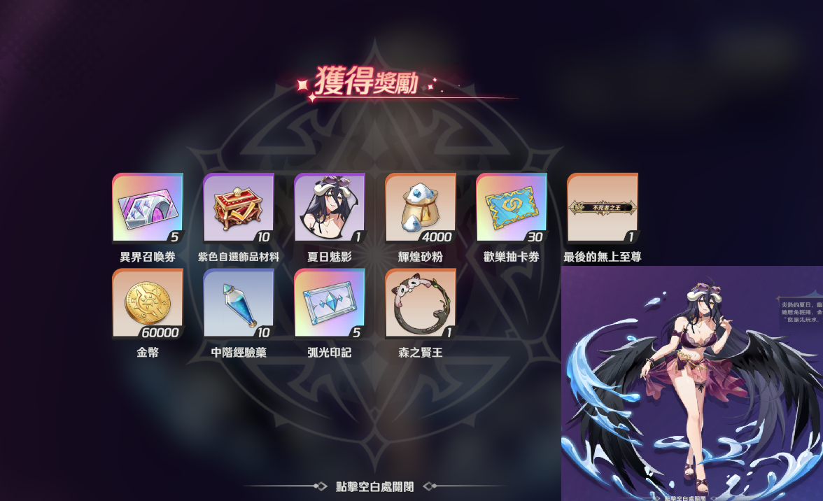 ' 雅兒貝德泳裝皮膚、異界召喚券*5、紫色自選飾品材料*10