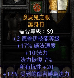 項鍊:2德魯伊17高施10法力+法力恢復7%+20全抗12傷轉法(89級)350