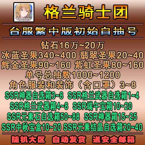 台服 單號16~20萬鑽+冰藍聖果*340~400+翡翠聖果*20~40+輝金聖果*90~200+紫虹聖果*80~160+角色服裝和裝飾(含口罩)*3~8+SSR神器自選箱*3~8+SSR格蘭武器自選箱*1~4+SSR格蘭武器箱*4~8+SSR端午寶箱*10~20+SSR元素石自選箱*50~88+SSR神器箱*15~25+SSR中秋寶盒*10~20+SSR元素結晶自選箱*20~40=460元