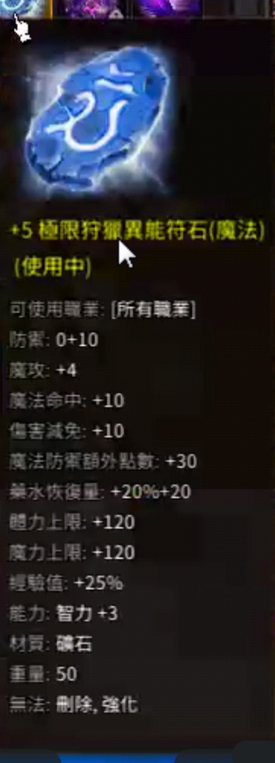 賣+5極限狩獵異能符石(魔法) 被攻擊時機率發動(極限防禦4秒)等於無敵四秒