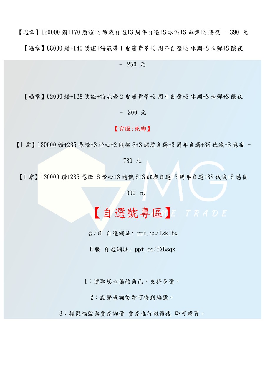 1.此為虚擬商品,不支持七天鑑賞期,介意勿購。 2.移交如有問題請勿更動帳號及綁定,請先聯繫賣家。 3.確認帳號無誤後,請依遊戲綁定方式更改密碼及綁定。 4.為避免交易糾紛,下單前請確認商品內容是否變更,未標示資源為隨機。 5.購買後14天內封號可保固退換 (發貨後開始計算時間), 14天後依封號原因判定,購買即視為同意此協議! 台/日 自選網址: ppt.cc/fsk1bx B服 自選網址: ppt.cc/fXBsqx
