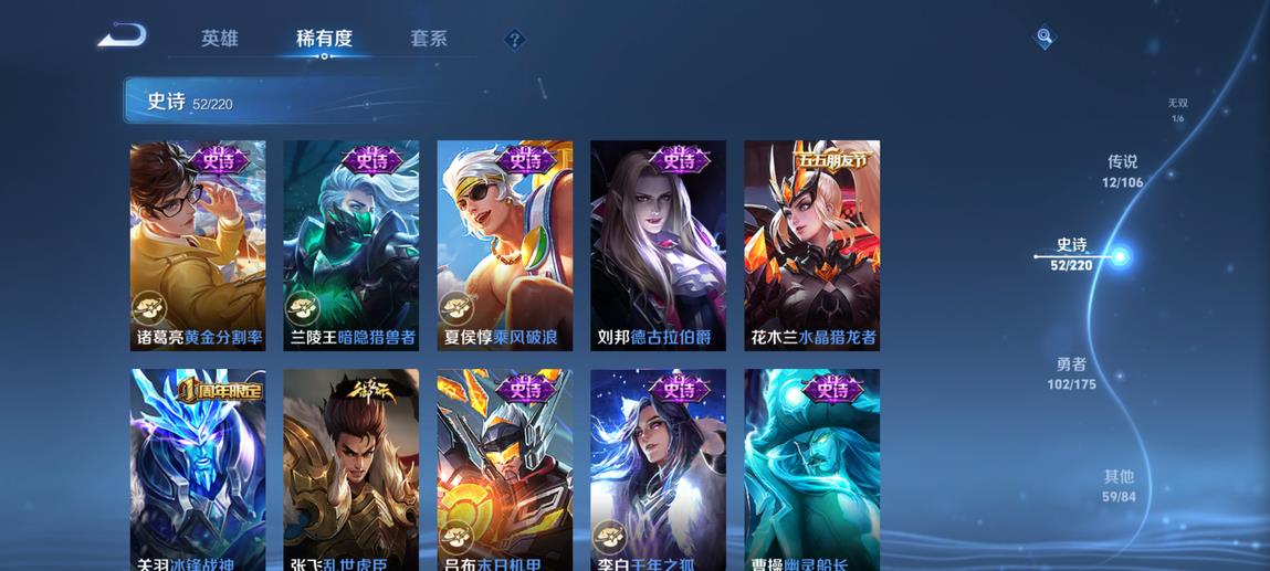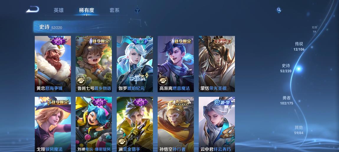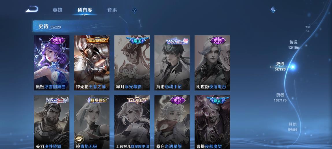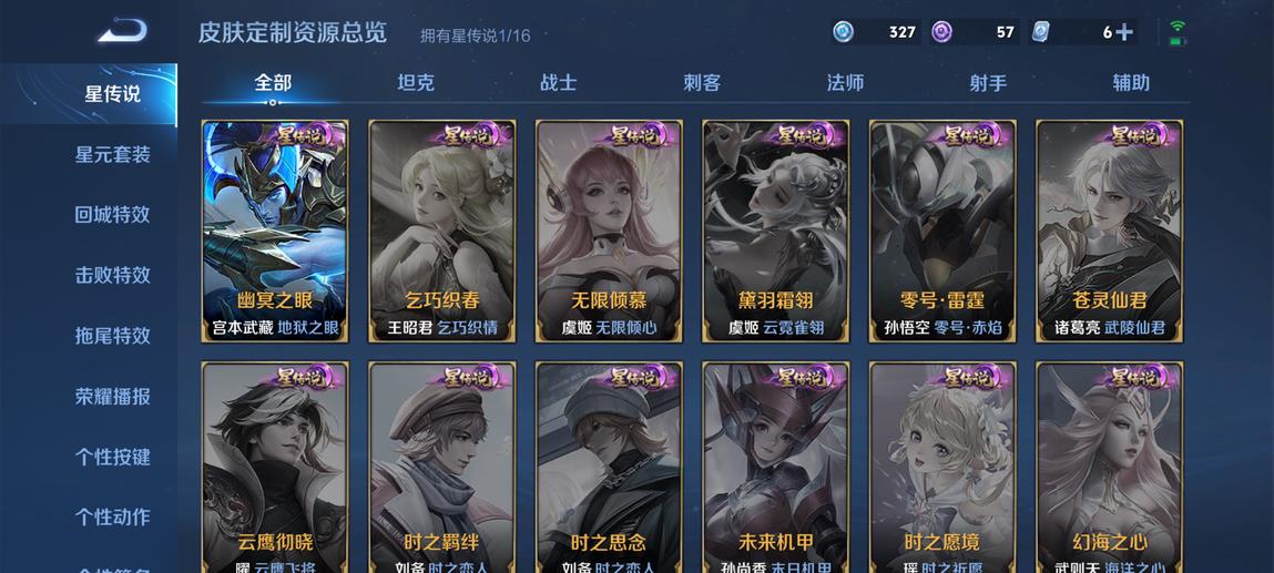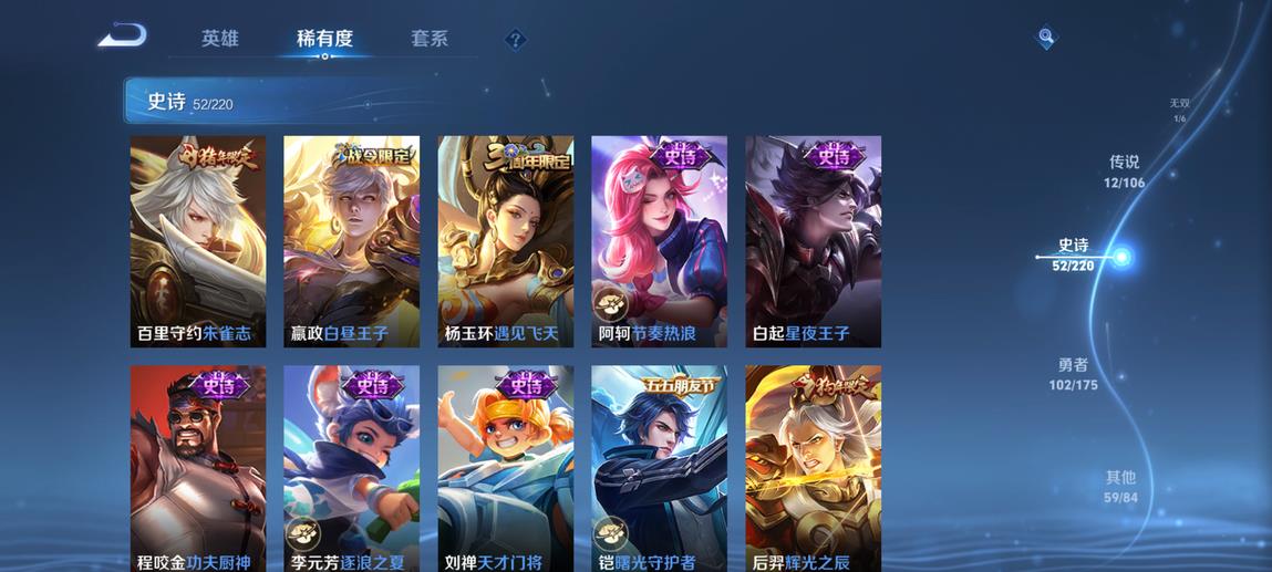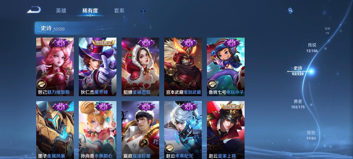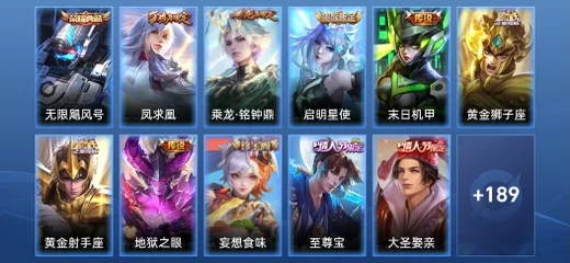 宮本武藏-鬼劍武藏,黃忠-怒海爭鋒,蒙恬-蔚藍守將,西施-歸虛夢演,嬴政-搖滾巨星,趙雲-白執事,阿軻-節奏熱浪,曹操-幽靈船長,劉邦-聖殿之光,白起-星夜王子,劉禪-喚靈魔甲,魯班七號-電玩小子,狂鐵-特工戰影,李元芳-逐浪之夏,桑啟-畫中遊,甄姬-花好人間,孫尚香-沉穩之力,程咬金-功夫廚神,露娜-哥特玫瑰,哪吒-三太子,暃-碧珀緋影,劉禪-天才門將,貂蟬-聖誕戀歌,劉備-萬事如意,羋月-紅桃皇后,曹操-超能戰警,老夫子-潮流仙人,蔡文姬-薔薇王座,呂布-末日機甲,甄姬-冰雪圓舞曲,艾琳-流音漫舞,高漸離-金屬狂潮,劉禪-英喵野望,弈星-踏雪尋梅,孫臏-未來旅行,李白-敏銳之力,米萊狄-精準探案法,諸葛亮-掌控之力,張良-古海尋蹤,海月-王牌新星,亞連-破局者,宮本武藏-永珍初新,李元芳-妄想特派,夏侯惇-乘風破浪,墨子-金屬風暴,姬小滿-零食大作戰,程咬金-無雙福將,瀾-賞金獵手,蘭陵王-暗隱獵獸者,劉禪-電玩·爆裂旋風,諸葛亮-星航指揮官,張飛-亂世虎臣,趙雲-未來紀元,大喬-守護之力,萊西奧-西部遊俠,太乙真人-勁辣紅鍋,豬八戒-潮玩探月行,雲纓-赤焰之纓,孫臏-天使之翼,張良-繽紛繪卷,曹操-死神來了,蒙恬-秩序獵龍將,露娜-瓷語鑑心,劉禪-秘密基地,司空震-啟蟄,瀾-孤獵,鏡-冰刃幻境,關羽-龍騰萬里,狄仁傑-錦衣衛,魯班大師-歸虛夢演,蒙犽-歸虛夢演,嫦娥-露花倒影,東皇太一-東海龍王,鍾馗-地府判官,橘右京-修羅,楊戩-埃及法老,白起-白色死神,夢奇-美夢成真,阿古朵-熊喵少女,趙雲-忍·炎影,盾山-圓桌騎士,貂蟬-異域舞娘,花木蘭-兔女郎,沈夢溪-棒球奇才,達摩-大發明家,豬八戒-年年有餘,張飛-五福同心,哪吒-次元突破,馬超-倖存者,劉備-漢昭烈帝,蘭陵王-隱刃,司馬懿-魘語軍師,成吉思汗-維京掠奪者,姜子牙-熾熱元素使,沈夢溪-鯊炮海盜貓,馬可波羅-激情綠茵,孫臏-歸虛夢演,狄仁傑-鷹眼統帥,曜-歸虛夢演,呂布-野性能量,孫尚香-水果甜心,雲中君-荷魯斯之眼,小喬-丁香結,蘇烈-堅韌之力,瑤-森,上官婉兒-修竹墨客,莊周-奇妙博物學,盤古-創世神祝,張良-幽蘭居士,劉邦-德古拉伯爵,魯班七號-木偶奇遇記,李信-灼熱之刃,明世隱-虹雲星官,狂鐵-命運角鬥場,項羽-科學大爆炸,裴擒虎-街頭旋風,大喬-伊勢巫女,元歌-午夜歌劇院,百里守約-絕影神槍,達摩-拳王,鬼谷子-幻樂之宴,扁鵲-化身博士,鎧-曙光守護者,干將莫邪-第七人偶,墨子-進擊墨子號,孫策-海之征途,露娜-緋紅之刃,百里玄策-威尼斯狂歡,老夫子-功夫老勺,蘇烈-愛與和平,王昭君-幻想奇妙夜,公孫離-花間舞,黃忠-芝加哥教父,韓信-街頭霸王,諸葛亮-黃金分割率,李白-千年之狐,花木蘭-水晶獵龍者,孫悟空-西部大鏢客,宮本武藏-霸王丸,阿軻-致命風華,鍾無豔-海灘麗影,李白-範海辛,花木蘭-劍舞者,周瑜-海軍大將,韓信-教廷特使,劉備-紐約教父,亞瑟-死亡騎士,妲己-魅力維加斯,妲己-少女阿狸