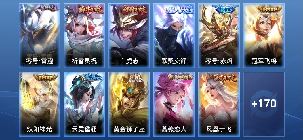 夢奇-頑趣,鬼谷子-五穀豐年,雅典娜-黎明之約,豬八戒-豬悟能,孫尚香-薔薇戀人,裴擒虎-天狼狩獵者,孫臏-天狼運算者,蔡文姬-繁星吟遊,雲中君-纖雲弄巧,狄仁傑-魔術師,馬可波羅-暗影遊獵,王昭君-鳳凰于飛,典韋-藍色畫面警告,花木蘭-默契交鋒,羋月-白晶晶,干將莫邪-冰霜戀舞曲,百里玄策-原初追逐者,李元芳-銀河之約,趙雲-皇家上將,元歌-雲間偶戲,上官婉兒-梁祝,嬴政-白晝王子,蒙犽-狂想玩偶喵,裴擒虎-李小龍,楊玉環-遇見飛天