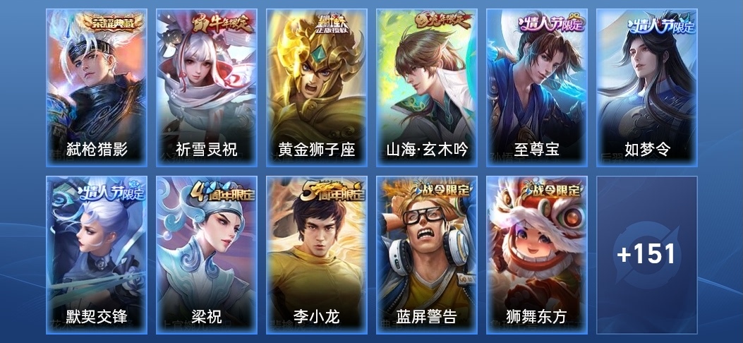 暃-星界遊俠,馬可波羅-山海·玄木吟,夢奇-頑趣,雅典娜-黎明之約,裴擒虎-李小龍,老夫子-航海奇遇記,元歌-雲間偶戲,干將莫邪-冰霜戀舞曲,虞姬-霸王別姬,花木蘭-默契交鋒,雲中君-纖雲弄巧,百里玄策-原初追逐者,蔡文姬-繁星吟遊,孫悟空-至尊寶,李元芳-銀河之約,后羿-如夢令,蘭陵王-馴魔獵人,上官婉兒-梁祝,魯班七號-獅舞東方,狄仁傑-魔術師,趙雲-皇家上將,典韋-藍色畫面警告