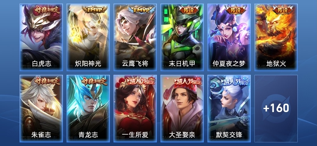 阿古朵-江河有靈,夢奇-頑趣,鬼谷子-五穀豐年,雅典娜-黎明之約,百里玄策-原初追逐者,花木蘭-默契交鋒,裴擒虎-李小龍,蘭陵王-馴魔獵人,蔡文姬-繁星吟遊,上官婉兒-梁祝,嬴政-白晝王子,露娜-一生所愛,孫悟空-大聖娶親,鎧-青龍志,百里守約-朱雀志,東皇太一-逐夢之光,楊玉環-遇見飛天,關羽-冰鋒戰神,馬可波羅-逐夢之星,狄仁傑-魔術師,趙雲-皇家上將