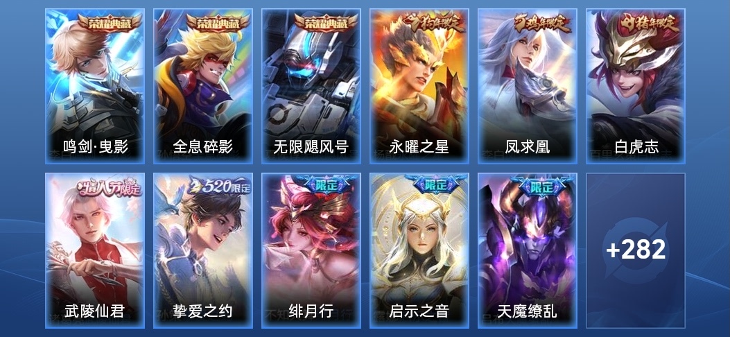 蔡文姬-舞動綠茵,蘭陵王-隱刃,張良-古海尋蹤,呂布-聖誕狂歡,桑啟-畫中遊,姬小滿-零食大作戰,劉禪-喚靈魔甲,白起-樂園追獵者,李元芳-逐浪之夏,豬八戒-潮玩探月行,牛魔-牛運亨通,海月-幻泉霧影,阿軻-節奏熱浪,廉頗-地獄巖魂,典韋-黃金武士,貂蟬-聖誕戀歌,阿古朵-熊喵少女,關羽-龍騰萬里,諸葛亮-黃金分割率,程咬金-功夫廚神,劉備-潮玩造夢師,伽羅-花見巫女,戈婭-危途狂花,安琪拉-玩偶對對碰,艾琳-奇遇舞章,明世隱-占星師,蒙恬-蔚藍守將,蒙犽-胡桃狂想曲,曹操-超能戰警,司空震-啟蟄,魯班七號-電玩小子,張良-千籌問戰,狂鐵-特工戰影,馬可波羅-激情綠茵,墨子-龍騎士,夏洛特-永晝,瑤-遇見神鹿,東皇太一-東海龍王,蒙恬-秩序獵龍將,雅典娜-戰爭女神,程咬金-無雙福將,貂蟬-異域舞娘,小喬-繽紛獨角獸,蒙犽-歸虛夢演,瀾-賞金獵手,米萊狄-契約魔法,阿軻-暗夜貓娘,甄姬-冰雪圓舞曲,不知火舞-魅語,橘右京-修羅,娜可露露-晚螢,孫尚香-沉穩之力,劉邦-虎嘯劍宗,露娜-哥特玫瑰,雲纓-赤焰之纓,瀾-孤獵,王昭君-精靈公主,典韋-鐵甲之心,黃忠-芝加哥教父,趙雲-忍·炎影,劉禪-秘密基地,大喬-守護之力,沈夢溪-鯊炮海盜貓,魯班大師-乓乓大師,蘇烈-堅韌之力,老夫子-潮流仙人,孫策-貓狗日記,鏡-冰刃幻境,羋月-紅桃皇后,周瑜-海軍大將,盾山-圓桌騎士,宮本武藏-永珍初新,韓信-街頭霸王,成吉思汗-維京掠奪者,曹操-幽靈船長,哪吒-三太子,哪吒-次元突破,趙雲-未來紀元,達摩-大發明家,魯班七號-黑桃隊長,李元芳-特種部隊,狄仁傑-錦衣衛,魯班大師-歸虛夢演,劉備-萬事如意,盤古-創世神祝,姜子牙-熾熱元素使,西施-歸虛夢演,公孫離-無限星賞官,夏侯惇-戰爭騎士,阿軻-愛心護理,項羽-蒼穹之光,馬超-倖存者,孫臏-歸虛夢演,王昭君-偶像歌手,劉禪-天才門將,曹操-死神來了,雲中君-荷魯斯之眼,花木蘭-兔女郎,妲己-魅力維加斯,白起-星夜王子,狄仁傑-鷹眼統帥,張飛-五福同心,孫策-海之征途,曜-歸虛夢演,呂布-野性能量,上官婉兒-修竹墨客,裴擒虎-梅西,伽羅-箭羽風息,小喬-丁香結,孫尚香-水果甜心,宮本武藏-未來紀元,劉邦-德古拉伯爵,夏侯惇-乘風破浪,宮本武藏-鬼劍武藏,白起-白色死神,莊周-奇妙博物學,明世隱-虹雲星官,張良-幽蘭居士,豬八戒-年年有餘,嫦娥-露花倒影,孫尚香-火炮千金,李信-灼熱之刃,項羽-科學大爆炸,司馬懿-魘語軍師,沈夢溪-棒球奇才,安琪拉-如懿,老夫子-功夫老勺,鬼谷子-幻樂之宴,達摩-拳王,扁鵲-化身博士,劉備-紐約教父,墨子-進擊墨子號,元歌-午夜歌劇院,鎧-曙光守護者,牛魔-制霸全明星,狂鐵-命運角鬥場,百里守約-特工魅影,韓信-教廷特使,張良-一千零一夜,弈星-踏雪尋梅,劉備-漢昭烈帝,王昭君-幻想奇妙夜,裴擒虎-街頭旋風,鍾無豔-海灘麗影,花木蘭-水晶獵龍者,楊玉環-霓裳曲,安琪拉-心靈駭客,亞瑟-心靈戰警,公孫離-花間舞,程咬金-華爾街大亨,妲己-仙境愛麗絲,宮本武藏-霸王丸,女媧-尼羅河女神,阿軻-致命風華,夢奇-美夢成真,蘇烈-愛與和平,鍾馗-地府判官,甄姬-花好人間,露娜-緋紅之刃,蘭陵王-暗隱獵獸者,百里守約-絕影神槍,鎧-龍域領主,楊戩-埃及法老,妲己-少女阿狸,大喬-伊勢巫女,亞瑟-死亡騎士