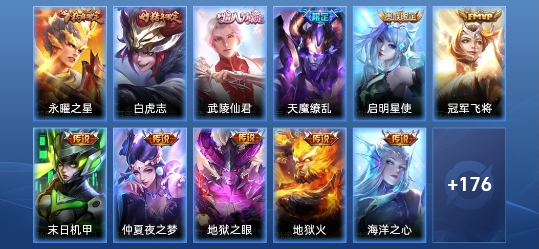 李元芳-逐浪之夏,虞姬-加勒比小姐,程咬金-無雙福將,夏洛特-永晝,孫尚香-沉穩之力,瀾-孤獵,李白-範海辛,老夫子-潮流仙人,甄姬-花好人間,姜子牙-熾熱元素使,花木蘭-兔女郎,魯班大師-乓乓大師,嫦娥-露花倒影,張飛-亂世虎臣,雲纓-赤焰之纓,孫臏-天使之翼,百里玄策-熱力迴旋,張良-繽紛繪卷,劉禪-秘密基地,阿古朵-熊喵少女,上官婉兒-修竹墨客,司空震-啟蟄,鏡-冰刃幻境,甄姬-冰雪圓舞曲,蒙犽-歸虛夢演,白起-白色死神,蒙恬-秩序獵龍將,明世隱-虹雲星官,妲己-少女阿狸,沈夢溪-鯊炮海盜貓,鬼谷子-幻樂之宴,鍾無豔-海灘麗影,哪吒-次元突破,扁鵲-化身博士,孫臏-歸虛夢演,王昭君-幻想奇妙夜,牛魔-制霸全明星,豬八戒-年年有餘,亞瑟-死亡騎士,蔡文姬-薔薇王座,夏侯惇-戰爭騎士,哪吒-三太子,鍾無豔-生化警戒,李元芳-特種部隊,東皇太一-東海龍王,狂鐵-命運角鬥場,魯班大師-歸虛夢演,西施-歸虛夢演,李信-灼熱之刃,伽羅-花見巫女,弈星-踏雪尋梅,大喬-伊勢巫女,黃忠-芝加哥教父,程咬金-華爾街大亨,曹操-死神來了,夢奇-美夢成真,王昭君-精靈公主,干將莫邪-第七人偶,馬可波羅-激情綠茵,百里玄策-威尼斯狂歡,馬超-倖存者,曜-歸虛夢演,雲中君-荷魯斯之眼,沈夢溪-棒球奇才,司馬懿-魘語軍師,孫策-海之征途,元歌-午夜歌劇院,裴擒虎-街頭旋風,成吉思汗-維京掠奪者,夏侯惇-乘風破浪,劉禪-英喵野望,鎧-龍域領主,鬼谷子-阿摩司公爵,露娜-緋紅之刃,韓信-教廷特使,宮本武藏-霸王丸,蘭陵王-暗隱獵獸者,孫策-貓狗日記,鎧-曙光守護者,小喬-繽紛獨角獸,大喬-貓狗日記,墨子-金屬風暴,貂蟬-聖誕戀歌,程咬金-功夫廚神,呂布-聖誕狂歡,李白-千年之狐,露娜-紫霞仙子,曹操-幽靈船長,劉邦-德古拉伯爵,白起-星夜王子,嬴政-暗夜貴公子,韓信-白龍吟,花木蘭-水晶獵龍者,娜可露露-晚螢,孫尚香-水果甜心,阿軻-節奏熱浪,百里守約-特工魅影,項羽-科學大爆炸,魯班七號-黑桃隊長,蘇烈-堅韌之力,牛魔-西部大鏢客,羋月-紅桃皇后,姜子牙-時尚教父,盤古-創世神祝,安琪拉-如懿,宮本武藏-永珍初新,張良-幽蘭居士,達摩-拳王,劉備-紐約教父,老夫子-功夫老勺,張飛-五福同心,諸葛亮-掌控之力,狄仁傑-鷹眼統帥,雅典娜-冰冠公主,妲己-魅力維加斯,韓信-街頭霸王,劉備-萬事如意,阿軻-愛心護理,達摩-大發明家,露娜-哥特玫瑰,典韋-黃金武士,趙雲-忍·炎影,后羿-阿爾法小隊,劉備-漢昭烈帝,呂布-野性能量,楊玉環-霓裳曲