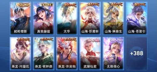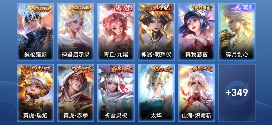 上官婉兒-群星魔術團,廉頗-寅虎·御盾,孫臏-寅虎·展翼,典韋-藍色畫面警告,魯班七號-蔬鄉物語,曹操-夜都魔契,羋月-白晶晶,楊玉環-寅虎·心曲,后羿-如夢令,嫦娥-如夢令,老夫子-航海奇遇記,高漸離-燃音魔法,大喬-乘龍·憶丹青,安琪拉-乘龍·聚寶船,伽羅-琥珀紀元,牛魔-奔雷神使,雲中君-纖雲弄巧,公孫離-玉兔公主,嫦娥-拒霜思,典韋-岱宗,蒙犽-百解令,花木蘭-瑞麟志,西施-至美·乘鯉謠,韓信-傲雪梅槍,司空震-地獄燃心,阿古朵-江河有靈,魯班七號-乒乒小將,李元芳-匿光偵查者,公孫離-蜜橘之夏,狂鐵-電玩高手,曹操-天狼征服者,趙懷真-鶴歸松棲,干將莫邪-冰霜戀舞曲,戈婭-馭風魔法,呂布-御風驍將,趙雲-引擎之心,蒙犽-狂想玩偶喵,沈夢溪-匿光破解者,扁鵲-奇幻香蹤,關羽-百相守夢,劉備-百相守夢,孫尚香-薔薇戀人,鎧-青龍志,孫悟空-至尊寶,蘇烈-玄武志,黃忠-火炮紳士,周瑜-真愛至上,暃-星界遊俠,小喬-純白花嫁,張飛-虎魄,黃忠-烈魂,趙雲-龍膽,韓信-飛衡,瑤-山海·碧波行,馬可波羅-山海·玄木吟,百里守約-朱雀志,狄仁傑-魔術師,馬超-神威,趙雲-皇家上將,鍾無豔-超時空戰士,元歌-無心,鬼谷子-五穀豐年,豬八戒-豬悟能,裴擒虎-李小龍,甄姬-遊園驚夢