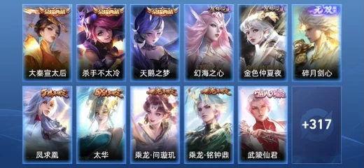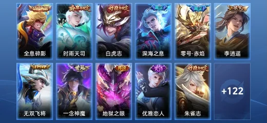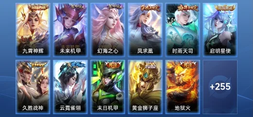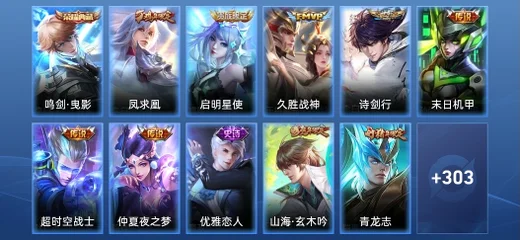劉禪-喚靈魔甲,哪吒-雪上飛焰,張良-古海尋蹤,魯班大師-乓乓大師,艾琳-流音漫舞,亞連-破局者,萊西奧-末日機甲,趙雲-白執事,哪吒-熱血海灘,鏡-真我赫茲,百里守約-真我赫茲,李元芳-妄想特派,海月-浮夢羅煙,墨子-龍騎士,米萊狄-完美假期,姬小滿-零食大作戰,沈夢溪-月團寄思,宮本武藏-鬼劍武藏,鎧-曙光守護者,大喬-貓狗日記,露娜-紫霞仙子,蒙犽-龍鼓爭鳴,曹操-幽靈船長,楊戩-天秀·啟明,劉禪-電玩·爆裂旋風,蔡文姬-電玩·兔頑號,魯班七號-電玩小子,百里玄策-熱力迴旋,太乙真人-圓桌騎士,萊西奧-西部遊俠,阿軻-暗夜貓娘,貂蟬-喚靈魅影,太乙真人-勁辣紅鍋,孫臏-未來旅行,項羽-蒼穹之光,小喬-萬聖前夜,瀾-孤獵,鍾無豔-生化警戒,劉邦-聖殿之光,蘭陵王-隱刃,貂蟬-異域舞娘,魯班七號-福祿兄弟,桑啟-畫中遊,嫦娥-露花倒影,趙懷真-太極少年,姜子牙-時尚教父,楊戩-埃及法老,明世隱-占星師,米萊狄-精準探案法,女媧-尼羅河女神,裴擒虎-街頭旋風,張飛-亂世虎臣,孫悟空-西部大鏢客,關羽-天啟騎士,雲中君-荷魯斯之眼,大喬-白蛇,瑤-森,呂布-末日機甲,小喬-青蛇,安琪拉-玩偶對對碰,花木蘭-劍舞者,程咬金-星際陸戰隊,趙雲-未來紀元,蒙恬-蔚藍守將,弈星-滕王閣序,鏡-玫瑰異探,項羽-帝國元帥,公孫離-無限星賞官,宮本武藏-未來紀元,周瑜-海軍大將,諸葛亮-掌控之力,亞瑟-死亡騎士,蔡文姬-舞動綠茵,牛魔-西部大鏢客,孫臏-天使之翼,典韋-黃金武士,孫尚香-時之戀人,鍾馗-樂園奇幻夜,魯班大師-歸虛夢演,白起-樂園追獵者,雅典娜-戰爭女神,鬼谷子-阿摩司公爵,橘右京-修羅,娜可露露-晚螢,伽羅-箭羽風息,牛魔-牛運亨通,韓信-街頭霸王,阿軻-節奏熱浪,狄仁傑-錦衣衛,豬八戒-潮玩探月行,妲己-女僕咖啡,盾山-極冰防禦線,劉禪-紳士熊喵,元歌-午夜歌劇院,艾琳-奇遇舞章,阿軻-愛心護理,孫尚香-沉穩之力,不知火舞-魅語,扁鵲-救世之瞳,后羿-阿爾法小隊,海月-幻泉霧影,李元芳-逐浪之夏,西施-詩語江南,蘭陵王-暗隱獵獸者,阿古朵-頑趣,程咬金-無雙福將,劉邦-虎嘯劍宗,雲纓-赤焰之纓,蘇烈-愛與和平,暃-碧珀緋影,墨子-金屬風暴,廉頗-地獄巖魂,大喬-守護之力,姜子牙-熾熱元素使,金蟬-前塵,高漸離-金屬狂潮,妲己-魅力維加斯,亞瑟-心靈戰警,露娜-哥特玫瑰,張良-繽紛繪卷,武則天-東方不敗,東皇太一-東海龍王,羋月-紅桃皇后,蒙犽-歸虛夢演,嬴政-搖滾巨星,露娜-瓷語鑑心,老夫子-潮流仙人,程咬金-功夫廚神,李白-千年之狐,百里守約-特工魅影,楊戩-次元傲視,白起-星夜王子,劉禪-秘密基地,王昭君-偶像歌手,司空震-啟蟄,甄姬-冰雪圓舞曲,安琪拉-心靈駭客,弈星-踏雪尋梅,伽羅-花見巫女,白起-白色死神,呂布-聖誕狂歡,夢奇-美夢成真,阿古朵-熊喵少女,夏侯惇-乘風破浪,蒙恬-秩序獵龍將,趙雲-忍·炎影,盾山-圓桌騎士,鏡-冰刃幻境,哪吒-三太子,達摩-大發明家,豬八戒-年年有餘,劉禪-天才門將,哪吒-次元突破,蘇烈-堅韌之力,魯班七號-黑桃隊長,甄姬-花好人間,小喬-繽紛獨角獸,劉備-漢昭烈帝,百里玄策-威尼斯狂歡,沈夢溪-鯊炮海盜貓,蔡文姬-薔薇王座,雅典娜-冰冠公主,西施-歸虛夢演,盤古-創世神祝,馬超-倖存者,張飛-五福同心,劉禪-英喵野望,狄仁傑-鷹眼統帥,曜-歸虛夢演,呂布-野性能量,孫尚香-水果甜心,劉邦-德古拉伯爵,小喬-丁香結,明世隱-虹雲星官,鎧-龍域領主,莊周-奇妙博物學,后羿-精靈王,劉備-萬事如意,曹操-死神來了,孫策-貓狗日記,魯班七號-木偶奇遇記,張良-幽蘭居士,鍾馗-地府判官,張良-一千零一夜,李元芳-特種部隊,上官婉兒-修竹墨客,李信-灼熱之刃,項羽-科學大爆炸,沈夢溪-棒球奇才,安琪拉-如懿,關羽-龍騰萬里,達摩-拳王,司馬懿-魘語軍師,鬼谷子-幻樂之宴,百里守約-絕影神槍,李白-敏銳之力,孫策-海之征途,老夫子-功夫老勺,狂鐵-命運角鬥場,牛魔-制霸全明星,王昭君-幻想奇妙夜,黃忠-芝加哥教父,嬴政-暗夜貴公子,公孫離-花間舞,楊玉環-霓裳曲,孫尚香-火炮千金,馬可波羅-激情綠茵,諸葛亮-黃金分割率,宮本武藏-霸王丸,劉備-紐約教父,阿軻-致命風華,成吉思汗-維京掠奪者,鍾無豔-海灘麗影,干將莫邪-第七人偶,墨子-進擊墨子號,花木蘭-水晶獵龍者,花木蘭-兔女郎,虞姬-加勒比小姐,貂蟬-聖誕戀歌,曹操-超能戰警,大喬-伊勢巫女,諸葛亮-星航指揮官,韓信-教廷特使,王昭君-精靈公主,程咬金-華爾街大亨,扁鵲-化身博士,宮本武藏-永珍初新,韓信-白龍吟,李白-範海辛,露娜-緋紅之刃,夏侯惇-戰爭騎士,妲己-少女阿狸