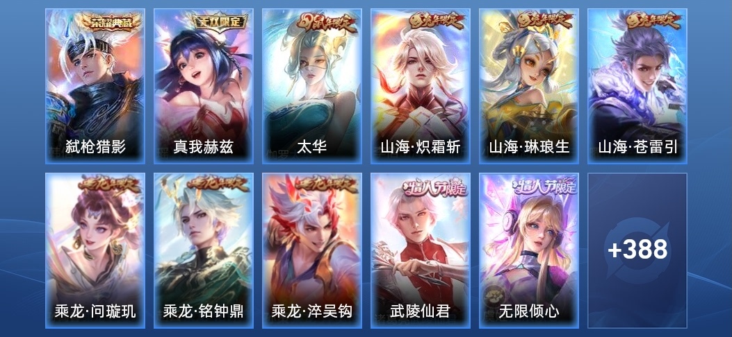 安琪拉-乘龍·聚寶船,大喬-乘龍·憶丹青,蒙犽-百解令,司空震-地獄燃心,妲己-時之奇旅,西施-至美·乘鯉謠,阿古朵-江河有靈,李元芳-匿光偵查者,趙懷真-鶴歸松棲,裴擒虎-天狼狩獵者,呂布-御風驍將,戈婭-馭風魔法,金蟬-唐三藏,扁鵲-奇幻香蹤,沈夢溪-匿光破解者,關羽-百相守夢,劉備-百相守夢,暃-星界遊俠,黃忠-烈魂,馬可波羅-山海·玄木吟,瑤-山海·碧波行,大喬-白鶴梁神女,墨子-降魔,元歌-無心,雅典娜-黎明之約,鬼谷子-五穀豐年,孫尚香-薔薇戀人,孫臏-寅虎·展翼,干將莫邪-真愛魔法,嫦娥-拒霜思,老夫子-聖誕老人,米萊狄-胡桃異想國,元歌-雲間偶戲,干將莫邪-冰霜戀舞曲,蒙犽-狂想玩偶喵,雲中君-纖雲弄巧,裴擒虎-李小龍,百里玄策-原初追逐者,馬可波羅-暗影遊獵,上官婉兒-天狼繪夢者,阿軻-迷蹤麗影,李元芳-銀河之約,韓信-飛衡,蔡文姬-繁星吟遊,蘭陵王-馴魔獵人,上官婉兒-梁祝,魯班七號-獅舞東方,典韋-藍色畫面警告,露娜-一生所愛,嬴政-白晝王子,孫悟空-大聖娶親,楊玉環-遇見飛天,甄姬-遊園驚夢,趙雲-引擎之心,狄仁傑-魔術師,貂蟬-逐夢之音,趙雲-皇家上將,項羽-霸王別姬