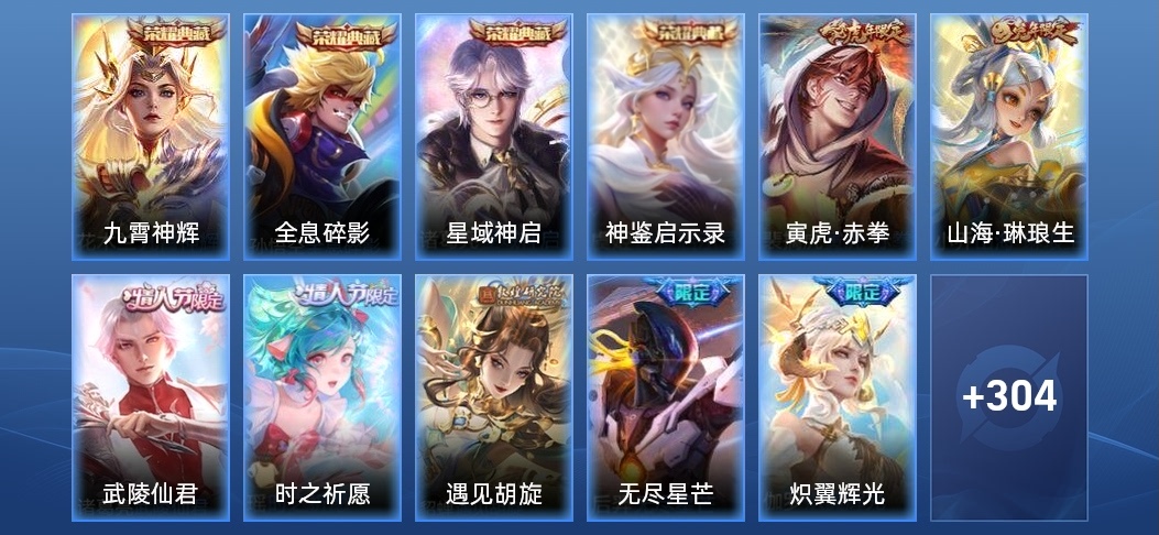 孫悟空-齊天大聖,伽羅-熾翼輝光,小喬-山海·琳琅生,貂蟬-遇見胡旋,孫尚香-異界靈契,馬可波羅-深海之息,后羿-無盡星芒,諸葛亮-武陵仙君,露娜-啟示之音,虞姬-啟明星使,瑤-時之祈願,裴擒虎-寅虎·赤拳