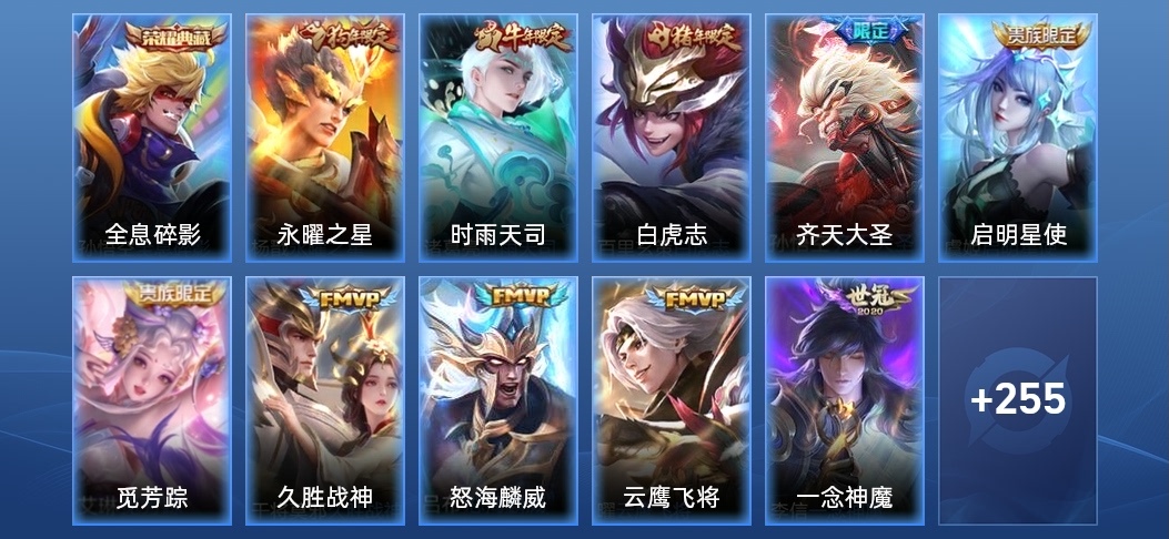 蔡文姬-舞動綠茵,桑啟-畫中遊,甄姬-冰雪圓舞曲,雲纓-赤焰之纓,張良-古海尋蹤,嬴政-搖滾巨星,蒙恬-蔚藍守將,蘭陵王-暗隱獵獸者,鎧-龍域領主,亞瑟-心靈戰警,白起-樂園追獵者,甄姬-花好人間,牛魔-牛運亨通,趙雲-白執事,豬八戒-潮玩探月行,海月-幻泉霧影,墨子-金屬風暴,貂蟬-聖誕戀歌,關羽-天啟騎士,戈婭-危途狂花,宮本武藏-鬼劍武藏,后羿-阿爾法小隊,程咬金-無雙福將,姜子牙-熾熱元素使,魯班大師-乓乓大師,狄仁傑-錦衣衛,張良-繽紛繪卷,大喬-守護之力,安琪拉-玩偶對對碰,劉備-萬事如意,白起-星夜王子,劉禪-秘密基地,司空震-啟蟄,瀾-孤獵,楊玉環-霓裳曲,劉邦-聖殿之光,嬴政-暗夜貴公子,娜可露露-晚螢,米萊狄-精準探案法,廉頗-無盡征程,大喬-貓狗日記,西施-歸虛夢演,白起-白色死神,廉頗-地獄巖魂,橘右京-修羅,阿古朵-熊喵少女,蒙犽-歸虛夢演,蒙恬-秩序獵龍將,公孫離-無限星賞官,孫尚香-時之戀人,呂布-聖誕狂歡,曹操-幽靈船長,盾山-圓桌騎士,張良-一千零一夜,花木蘭-兔女郎,鏡-冰刃幻境,魯班大師-歸虛夢演,不知火舞-魅語,伽羅-箭羽風息,劉備-紐約教父,達摩-大發明家,墨子-龍騎士,宮本武藏-永珍初新,孫策-貓狗日記,王昭君-偶像歌手,諸葛亮-黃金分割率,露娜-紫霞仙子,蘇烈-堅韌之力,魯班七號-黑桃隊長,項羽-帝國元帥,哪吒-次元突破,馬超-倖存者,狄仁傑-鷹眼統帥,程咬金-功夫廚神,阿軻-暗夜貓娘,弈星-踏雪尋梅,狂鐵-命運角鬥場,沈夢溪-鯊炮海盜貓,大喬-伊勢巫女,羋月-紅桃皇后,孫臏-歸虛夢演,諸葛亮-星航指揮官,老夫子-潮流仙人,典韋-黃金武士,李元芳-逐浪之夏,曜-歸虛夢演,盤古-創世神祝,孫尚香-水果甜心,李元芳-特種部隊,曹操-死神來了,雲中君-荷魯斯之眼,虞姬-加勒比小姐,瑤-森,上官婉兒-修竹墨客,姜子牙-時尚教父,莊周-奇妙博物學,夏侯惇-乘風破浪,女媧-尼羅河女神,阿軻-節奏熱浪,孫臏-未來旅行,韓信-街頭霸王,豬八戒-年年有餘,司馬懿-魘語軍師,李信-灼熱之刃,張良-幽蘭居士,伽羅-花見巫女,牛魔-西部大鏢客,明世隱-虹雲星官,嫦娥-露花倒影,蘭陵王-隱刃,元歌-午夜歌劇院,太乙真人-圓桌騎士,沈夢溪-棒球奇才,夏侯惇-戰爭騎士,諸葛亮-掌控之力,安琪拉-如懿,張飛-五福同心,安琪拉-心靈駭客,王昭君-精靈公主,關羽-龍騰萬里,劉備-漢昭烈帝,達摩-拳王,盾山-極冰防禦線,百里玄策-威尼斯狂歡,鬼谷子-幻樂之宴,扁鵲-化身博士,成吉思汗-維京掠奪者,鬼谷子-阿摩司公爵,宮本武藏-霸王丸,夢奇-美夢成真,孫策-海之征途,魯班七號-福祿兄弟,公孫離-花間舞,墨子-進擊墨子號,曹操-超能戰警,哪吒-三太子,楊戩-埃及法老,呂布-末日機甲,鎧-曙光守護者,明世隱-占星師,蘇烈-愛與和平,孫尚香-沉穩之力,馬可波羅-激情綠茵,干將莫邪-第七人偶,露娜-哥特玫瑰,孫悟空-西部大鏢客,李白-千年之狐,老夫子-功夫老勺,鍾馗-地府判官,鍾無豔-生化警戒,百里守約-絕影神槍,王昭君-幻想奇妙夜,裴擒虎-街頭旋風,劉禪-英喵野望,后羿-精靈王,黃忠-芝加哥教父,雅典娜-冰冠公主,小喬-繽紛獨角獸,李白-範海辛,劉邦-德古拉伯爵,東皇太一-東海龍王,程咬金-華爾街大亨,鍾無豔-海灘麗影,高漸離-金屬狂潮,雅典娜-戰爭女神,小喬-萬聖前夜,露娜-緋紅之刃,韓信-教廷特使,花木蘭-劍舞者,蔡文姬-薔薇王座,妲己-魅力維加斯,貂蟬-異域舞娘,妲己-少女阿狸,亞瑟-死亡騎士