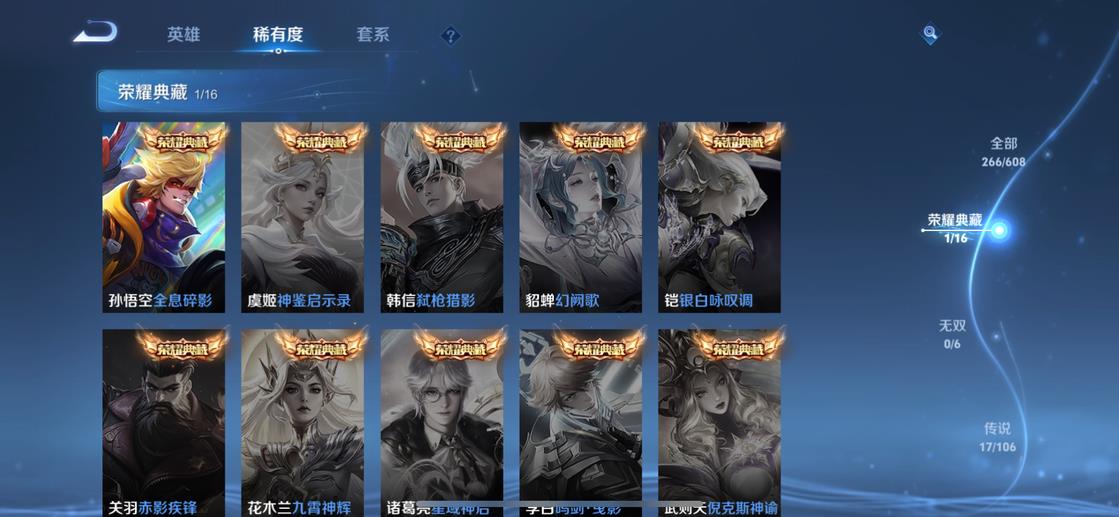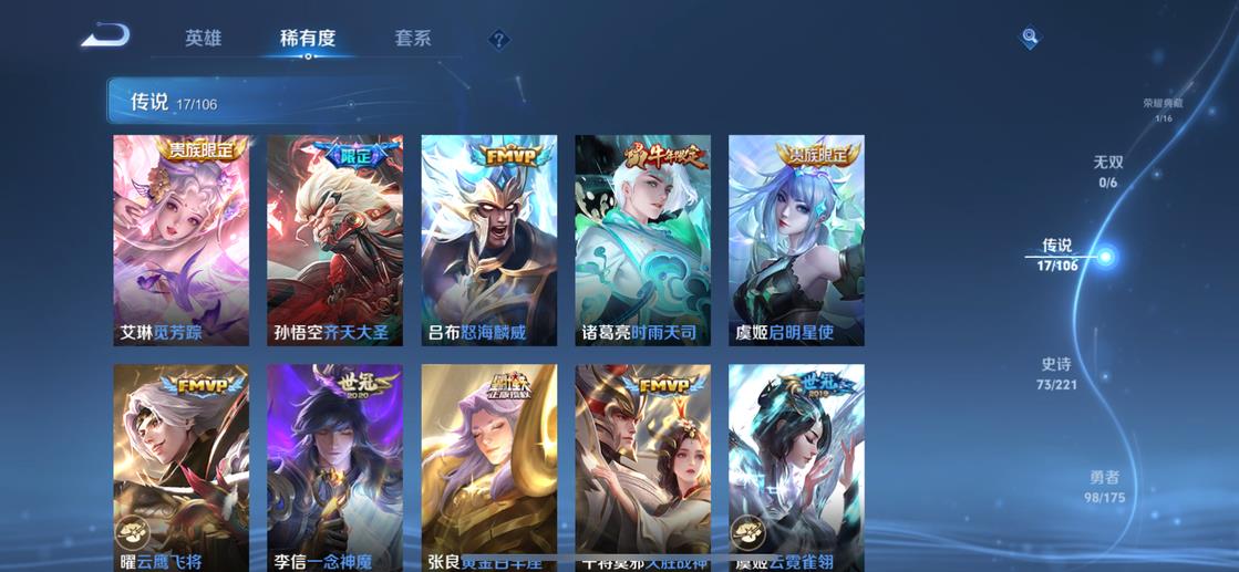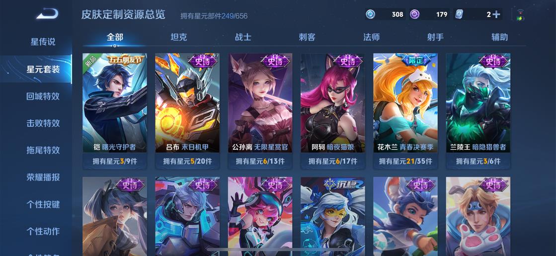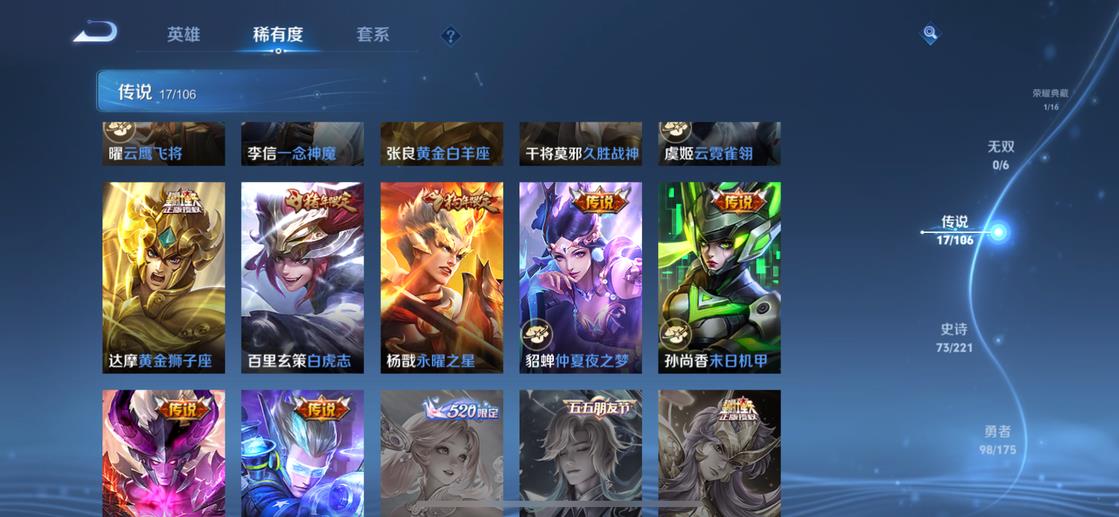 暃-星界遊俠,鬼谷子-五穀豐年,嬴政-優雅戀人,元歌-雲間偶戲,呂布-御風驍將,裴擒虎-李小龍,百里玄策-原初追逐者,馬可波羅-暗影遊獵,張飛-虎魄,馬超-神威,阿軻-迷蹤麗影,李元芳-銀河之約,蔡文姬-繁星吟遊,蘭陵王-馴魔獵人,孫尚香-薔薇戀人,上官婉兒-梁祝,鍾無豔-王者之錘,魯班七號-獅舞東方,雅典娜-神奇女俠,裴擒虎-天狼狩獵者,典韋-藍色畫面警告,嬴政-白晝王子,干將莫邪-冰霜戀舞曲,趙雲-引擎之心,東皇太一-逐夢之光,百里守約-朱雀志,楊玉環-遇見飛天,周瑜-真愛至上,花木蘭-青春決賽季,狄仁傑-魔術師,后羿-輝光之辰,趙雲-皇家上將,甄姬-遊園驚夢