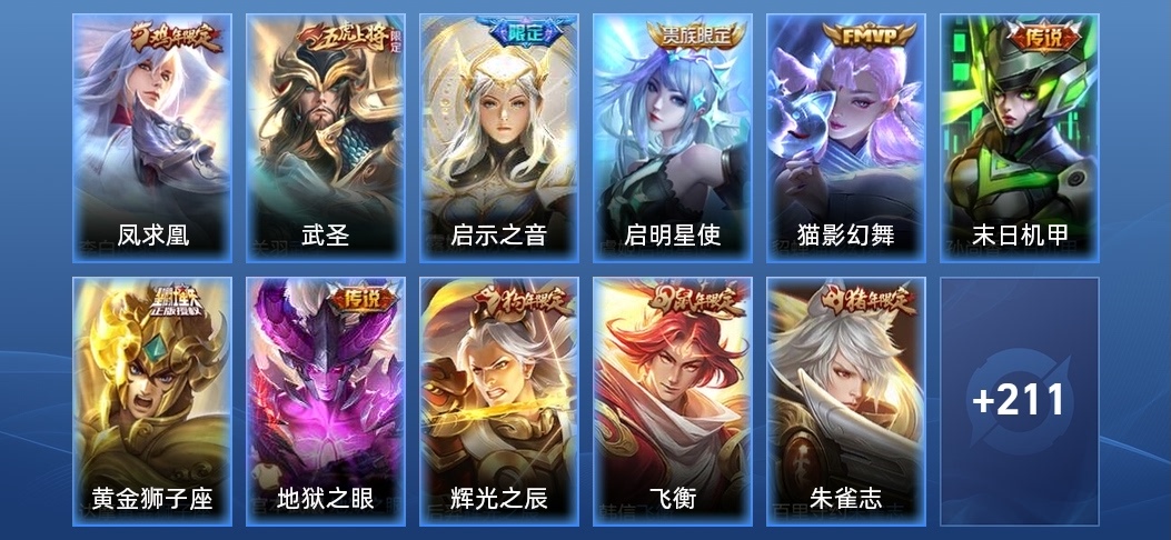 妲己-女僕咖啡,趙雲-忍·炎影,狂鐵-特工戰影,小喬-青蛇,鬼谷子-阿摩司公爵,呂布-野性能量,桑啟-畫中遊,老夫子-潮流仙人,張良-古海尋蹤,李元芳-妄想特派,劉禪-電玩·爆裂旋風,豬八戒-潮玩探月行,孫臏-天使之翼,典韋-黃金武士,趙雲-未來紀元,萊西奧-西部遊俠,雅典娜-冰冠公主,宮本武藏-永珍初新,劉邦-德古拉伯爵,姜子牙-熾熱元素使,劉備-潮玩造夢師,魯班大師-乓乓大師,妲己-魅力維加斯,曹操-超能戰警,米萊狄-契約魔法,程咬金-無雙福將,孫尚香-沉穩之力,宮本武藏-未來紀元,太乙真人-圓桌騎士,馬超-倖存者,夢奇-美夢成真,張飛-亂世虎臣,妲己-紫羅蘭之誓,花木蘭-兔女郎,墨子-龍騎士,貂蟬-異域舞娘,雲纓-赤焰之纓,呂布-聖誕狂歡,曹操-死神來了,項羽-蒼穹之光,白起-星夜王子,哪吒-次元突破,露娜-哥特玫瑰,盤古-重灌意志,張良-繽紛繪卷,劉禪-秘密基地,大喬-守護之力,露娜-瓷語鑑心,司馬懿-魘語軍師,楊戩-次元傲視,司空震-啟蟄,瀾-孤獵,甄姬-冰雪圓舞曲,曜-歸虛夢演,狄仁傑-錦衣衛,魯班大師-歸虛夢演,達摩-大發明家,楊玉環-霓裳曲,成吉思汗-維京掠奪者,劉禪-英喵野望,沈夢溪-鯊炮海盜貓,廉頗-無盡征程,白起-白色死神,瑤-森,墨子-金屬風暴,高漸離-金屬狂潮,干將莫邪-第七人偶,盾山-圓桌騎士,王昭君-偶像歌手,不知火舞-魅語,鬼谷子-幻樂之宴,哪吒-三太子,劉備-紐約教父,安琪拉-玩偶對對碰,伽羅-花見巫女,魯班七號-黑桃隊長,蒙犽-歸虛夢演,馬可波羅-激情綠茵,王昭君-精靈公主,李信-灼熱之刃,韓信-白龍吟,達摩-拳王,盤古-創世神祝,楊戩-埃及法老,黃忠-芝加哥教父,狄仁傑-鷹眼統帥,孫臏-歸虛夢演,虞姬-加勒比小姐,貂蟬-聖誕戀歌,李白-千年之狐,張飛-五福同心,孫尚香-水果甜心,小喬-丁香結,裴擒虎-梅西,蘇烈-愛與和平,宮本武藏-鬼劍武藏,小喬-萬聖前夜,莊周-奇妙博物學,后羿-精靈王,甄姬-花好人間,關羽-龍騰萬里,豬八戒-年年有餘,張良-幽蘭居士,明世隱-虹雲星官,諸葛亮-黃金分割率,嫦娥-露花倒影,程咬金-華爾街大亨,盾山-極冰防禦線,曹操-幽靈船長,亞瑟-心靈戰警,百里玄策-威尼斯狂歡,李白-敏銳之力,項羽-科學大爆炸,沈夢溪-棒球奇才,程咬金-愛與正義,公孫離-花間舞,韓信-街頭霸王,阿軻-節奏熱浪,雅典娜-戰爭女神,劉備-漢昭烈帝,孫悟空-西部大鏢客,老夫子-功夫老勺,諸葛亮-掌控之力,劉邦-聖殿之光,花木蘭-水晶獵龍者,扁鵲-化身博士,裴擒虎-街頭旋風,孫策-海之征途,元歌-午夜歌劇院,狂鐵-命運角鬥場,鍾無豔-海灘麗影,東皇太一-東海龍王,呂布-末日機甲,王昭君-幻想奇妙夜,韓信-教廷特使,羋月-紅桃皇后,劉備-萬事如意,亞瑟-死亡騎士,露娜-緋紅之刃,鎧-龍域領主,妲己-少女阿狸,魯班七號-福祿兄弟