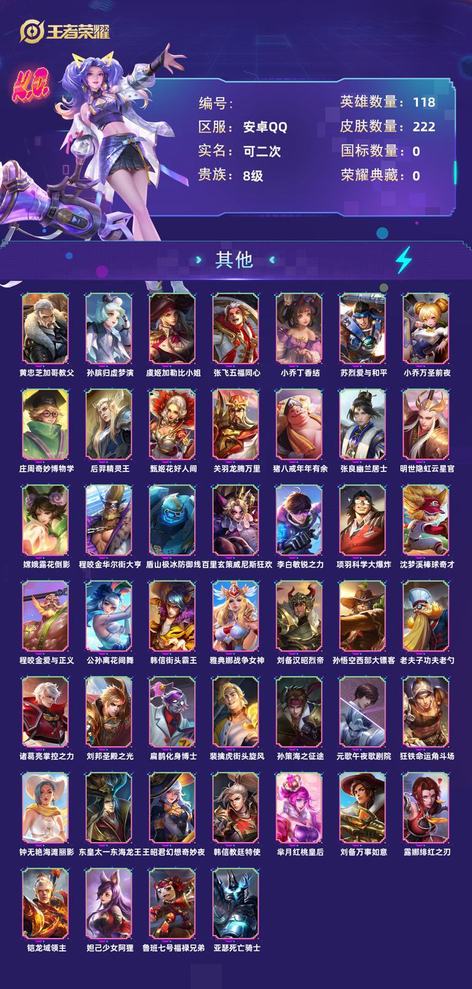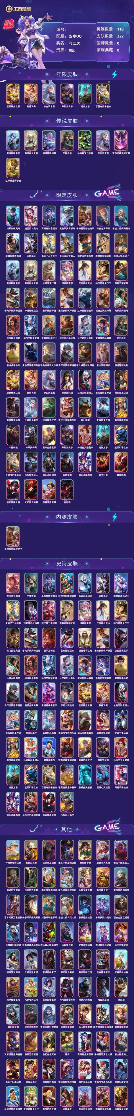 【6NK5EHBF】典藏0 傳說8 史詩60 英雄118 造型222 貴族8級 造型價值:144436 可排位 【年限造型6】 后羿輝光之辰 韓信飛衡 李白鳳求凰 蘇烈玄武志 鎧青龍志 百里守約朱雀志 【傳說造型8】 虞姬啟明星使 露娜啟示之音 貂蟬貓影幻舞 關羽武聖 孫尚香末日機甲 李白鳳求凰 宮本武藏地獄之眼 達摩黃金獅子座 【限定造型74】 劉邦劍破天穹 妲己靈卜魔法 高漸離燃音魔法 鬼谷