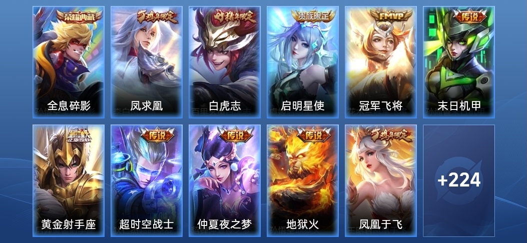 鏡-青焰無極,蒙恬-榮光聖徽,嫦娥-拒霜思,阿古朵-江河有靈,司空震-地獄燃心,李元芳-匿光偵查者,戈婭-馭風魔法,雅典娜-黎明之約,夢奇-頑趣,元歌-無心,鬼谷子-五穀豐年,元歌-雲間偶戲,干將莫邪-冰霜戀舞曲,雲中君-纖雲弄巧,蒙犽-狂想玩偶喵,百里玄策-原初追逐者,裴擒虎-李小龍,馬可波羅-暗影遊獵,孫悟空-至尊寶,典韋-岱宗,韓信-飛衡,王昭君-鳳凰于飛,曹操-天狼征服者,蘭陵王-馴魔獵人,蔡文姬-繁星吟遊,上官婉兒-梁祝,魯班七號-獅舞東方,裴擒虎-天狼狩獵者,典韋-藍色畫面警告,嬴政-白晝王子,狄仁傑-魔術師,蘇烈-玄武志,孫悟空-大聖娶親,露娜-一生所愛,趙雲-皇家上將,鎧-青龍志,百里守約-朱雀志