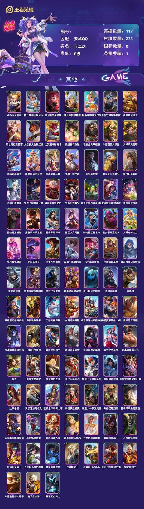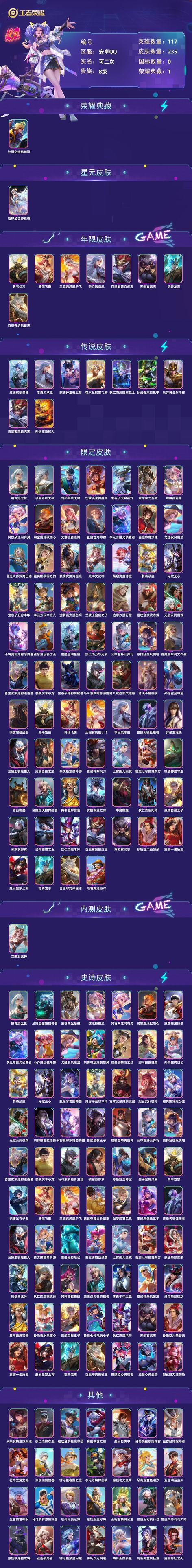 典藏1 傳說9 史詩70 英雄117 造型235 貴族8級 造型價值:177068 可排位 【榮耀典藏1】 孫悟空全息碎影 【星元造型1】 貂蟬金色仲夏夜 【年限造型8】 典韋岱宗 韓信飛衡 王昭君鳳凰于飛 李白鳳求凰 百里玄策白虎志 蘇烈玄武志 鎧青龍志 百里守約朱雀志 【傳說造型9】 虞姬啟明星使 李白鳳求凰 貂蟬仲夏夜之夢 花木蘭冠軍飛將 狄仁傑超時空戰士 孫尚香末日機甲 后羿黃金射手座