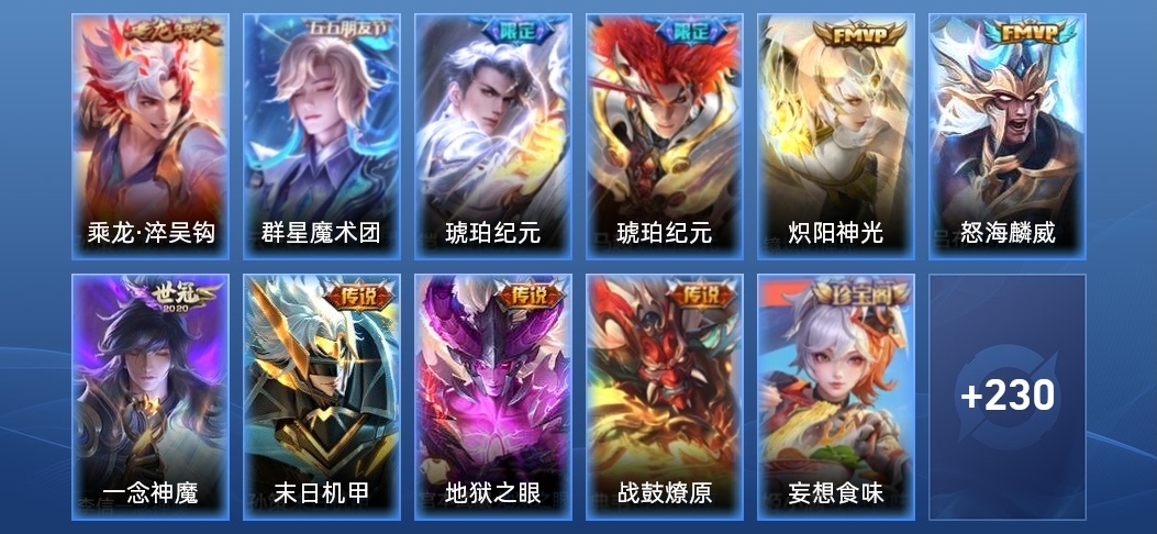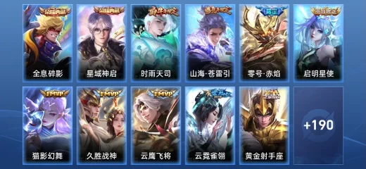 鏡-青焰無極,孫悟空-孫行者,姬小滿-妄想食味,上官婉兒-群星魔術團,典韋-藍色畫面警告,魯班七號-蔬鄉物語,蒙恬-榮光聖徽,后羿-如夢令,高漸離-燃音魔法,百里玄策-超元獵域,伽羅-琥珀紀元,蒙犽-百解令,典韋-岱宗,司空震-地獄燃心,阿古朵-江河有靈,李元芳-匿光偵查者,戈婭-馭風魔法,趙雲-引擎之心,扁鵲-奇幻香蹤,沈夢溪-匿光破解者,劉備-百相守夢,暃-星界遊俠,趙雲-龍膽,狄仁傑-魔術師,馬可波羅-山海·玄木吟,鍾無豔-超時空戰士,鬼谷子-五穀豐年,元歌-無心,嫦娥-拒霜思,干將莫邪-真愛魔法,裴擒虎-李小龍,莊周-高山流水,鎧-青龍志,趙雲-皇家上將,老夫子-航海奇遇記,魯班七號-乒乒小將