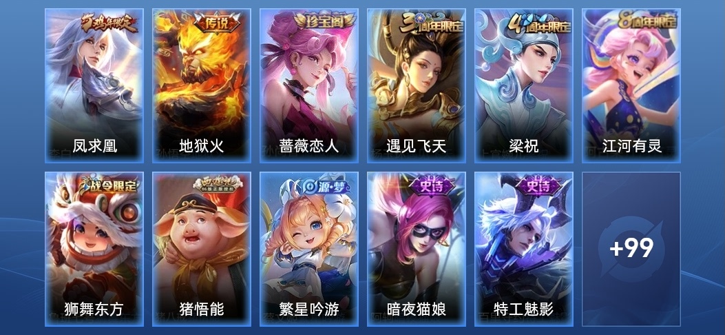 呂布-聖誕狂歡,程咬金-無雙福將,劉禪-天才門將,曜-歸虛夢演,花木蘭-劍舞者,伽羅-花見巫女,阿軻-暗夜貓娘,張良-古海尋蹤,劉禪-英喵野望,豬八戒-潮玩探月行,高漸離-金屬狂潮,墨子-金屬風暴,孫臏-未來旅行,狂鐵-特工戰影,夏侯惇-戰爭騎士,張良-一千零一夜,楊戩-埃及法老,司馬懿-魘語軍師,墨子-龍騎士,鏡-冰刃幻境,劉備-紐約教父,張飛-五福同心,魯班大師-乓乓大師,劉禪-秘密基地,雲纓-赤焰之纓,張良-繽紛繪卷,李信-灼熱之刃,哪吒-次元突破,蘇烈-堅韌之力,貂蟬-異域舞娘,鬼谷子-幻樂之宴,趙雲-未來紀元,豬八戒-年年有餘,趙雲-忍·炎影,盾山-圓桌騎士,哪吒-三太子,宮本武藏-霸王丸,元歌-午夜歌劇院,明世隱-占星師,亞瑟-心靈戰警,魯班七號-黑桃隊長,后羿-阿爾法小隊,老夫子-功夫老勺,馬可波羅-激情綠茵,劉備-漢昭烈帝,狄仁傑-鷹眼統帥,羋月-紅桃皇后,姜子牙-熾熱元素使,諸葛亮-黃金分割率,沈夢溪-鯊炮海盜貓,百里守約-特工魅影,貂蟬-聖誕戀歌,百里玄策-威尼斯狂歡,孫臏-歸虛夢演,典韋-黃金武士,曹操-死神來了,成吉思汗-維京掠奪者,孫尚香-水果甜心,呂布-野性能量,小喬-丁香結,大喬-伊勢巫女,莊周-奇妙博物學,安琪拉-玩偶對對碰,后羿-精靈王,張良-幽蘭居士,明世隱-虹雲星官,百里守約-絕影神槍,孫悟空-西部大鏢客,鍾無豔-海灘麗影,達摩-拳王,妲己-魅力維加斯,李白-範海辛,扁鵲-化身博士,魯班七號-木偶奇遇記,宮本武藏-永珍初新,韓信-教廷特使,亞瑟-死亡騎士,妲己-少女阿狸