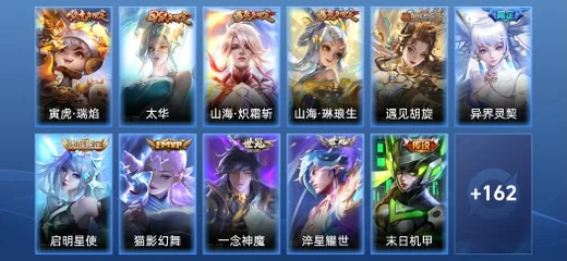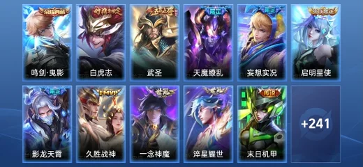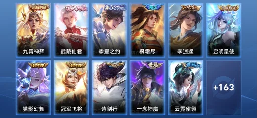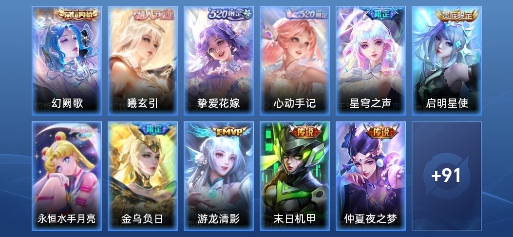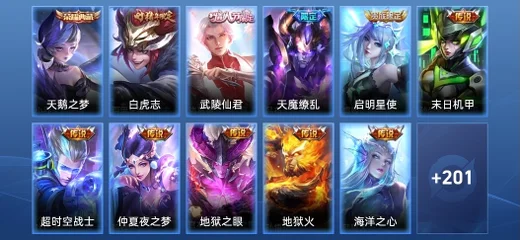 豬八戒-潮玩探月行,鬼谷子-阿摩司公爵,諸葛亮-掌控之力,妲己-女僕咖啡,呂布-末日機甲,安琪拉-玩偶對對碰,白起-白色死神,不知火舞-魅語,沈夢溪-鯊炮海盜貓,李信-灼熱之刃,孫臏-天使之翼,孫尚香-時之戀人,瀾-孤獵,馬超-倖存者,王昭君-偶像歌手,張良-幽蘭居士,劉備-潮玩造夢師,孫臏-未來旅行,嬴政-搖滾巨星,馬可波羅-激情綠茵,孫尚香-沉穩之力,韓信-教廷特使,大喬-貓狗日記,裴擒虎-街頭旋風,貂蟬-異域舞娘,鍾無豔-海灘麗影,弈星-踏雪尋梅,鎧-龍域領主,張飛-亂世虎臣,張良-繽紛繪卷,妲己-少女阿狸,蔡文姬-薔薇王座,蔡文姬-舞動綠茵,明世隱-虹雲星官,嫦娥-露花倒影,露娜-瓷語鑑心,張良-古海尋蹤,孫臏-歸虛夢演,瑤-遇見神鹿,娜可露露-晚螢,小喬-繽紛獨角獸,扁鵲-救世之瞳,孫尚香-水果甜心,羋月-紅桃皇后,桑啟-畫中遊,小喬-萬聖前夜,花木蘭-劍舞者,王昭君-幻想奇妙夜,李白-敏銳之力,瑤-森,伽羅-花見巫女,花木蘭-兔女郎,西施-歸虛夢演,鏡-冰刃幻境,大喬-伊勢巫女,大喬-守護之力,露娜-哥特玫瑰,貂蟬-聖誕戀歌,上官婉兒-修竹墨客,公孫離-花間舞,甄姬-冰雪圓舞曲,楊玉環-霓裳曲,花木蘭-水晶獵龍者,王昭君-精靈公主