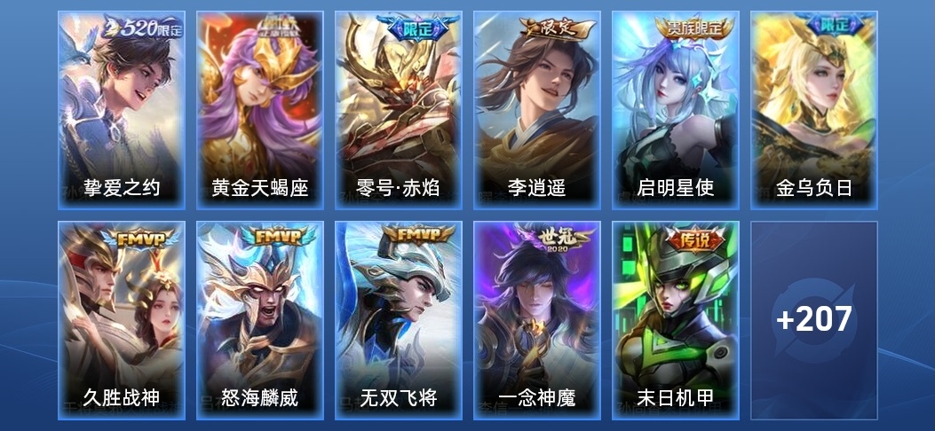 劉備-潮玩造夢師,弈星-踏雪尋梅,高漸離-金屬狂潮,鎧-曙光守護者,劉禪-秘密基地,小喬-青蛇,魯班七號-電玩小子,元歌-午夜歌劇院,露娜-瓷語鑑心,鎧-龍域領主,王昭君-幻想奇妙夜,白起-星夜王子,夢奇-美夢成真,姜子牙-熾熱元素使,夏洛特-永晝,娜可露露-晚螢,宮本武藏-永珍初新,橘右京-修羅,鍾馗-地府判官,司空震-啟蟄,艾琳-流音漫舞,程咬金-無雙福將,老夫子-潮流仙人,甄姬-冰雪圓舞曲,盾山-圓桌騎士,鍾無豔-聚星閃耀,亞連-破局者,阿古朵-熊喵少女,百里守約-真我赫茲,暃-碧珀緋影,扁鵲-救世之瞳,夏侯惇-乘風破浪,張良-古海尋蹤,海月-王牌新星,明世隱-虹雲星官,韓信-街頭霸王,哪吒-熱血海灘,小喬-繽紛獨角獸,呂布-野性能量,李元芳-妄想特派,亞瑟-心靈戰警,劉禪-電玩·爆裂旋風,劉邦-聖殿之光,哪吒-次元突破,萊西奧-西部遊俠,太乙真人-勁辣紅鍋,劉邦-德古拉伯爵,白起-樂園追獵者,豬八戒-潮玩探月行,蘭陵王-暗隱獵獸者,白起-白色死神,海月-幻泉霧影,李元芳-逐浪之夏,張良-繽紛繪卷,阿軻-愛心護理,安琪拉-玩偶對對碰,沈夢溪-鯊炮海盜貓,李白-範海辛,羋月-紅桃皇后,諸葛亮-掌控之力,曹操-超能戰警,大喬-貓狗日記,劉備-萬事如意,露娜-哥特玫瑰,廉頗-地獄巖魂,不知火舞-魅語,雅典娜-戰爭女神,雲纓-赤焰之纓,哪吒-三太子,太乙真人-圓桌騎士,關羽-天啟騎士,甄姬-花好人間,花木蘭-水晶獵龍者,老夫子-功夫老勺,關羽-龍騰萬里,大喬-守護之力,馬可波羅-激情綠茵,劉備-漢昭烈帝,張良-一千零一夜,狄仁傑-錦衣衛,魯班大師-乓乓大師,戈婭-危途狂花,趙雲-未來紀元,小喬-萬聖前夜,鬼谷子-幻樂之宴,東皇太一-東海龍王,阿軻-暗夜貓娘,貂蟬-聖誕戀歌,露娜-紫霞仙子,達摩-大發明家,宮本武藏-未來紀元,蒙恬-蔚藍守將,蒙犽-胡桃狂想曲,墨子-進擊墨子號,曜-歸虛夢演,蘇烈-愛與和平,花木蘭-兔女郎,瀾-賞金獵手,妲己-女僕咖啡,張飛-五福同心,米萊狄-契約魔法,劉禪-喚靈魔甲,呂布-末日機甲,李白-千年之狐,宮本武藏-鬼劍武藏,墨子-金屬風暴,劉禪-天才門將,扁鵲-化身博士,瀾-孤獵,安琪拉-心靈駭客,雅典娜-冰冠公主,孫策-海之征途,貂蟬-異域舞娘,百里守約-特工魅影,趙雲-忍·炎影,孫策-貓狗日記,阿軻-節奏熱浪,呂布-聖誕狂歡,劉邦-虎嘯劍宗,黃忠-芝加哥教父,諸葛亮-黃金分割率,宮本武藏-霸王丸,嬴政-搖滾巨星,司馬懿-魘語軍師,鍾無豔-海灘麗影,達摩-拳王,王昭君-精靈公主,典韋-黃金武士,蘭陵王-隱刃,程咬金-功夫廚神,百里守約-絕影神槍,狄仁傑-鷹眼統帥,韓信-教廷特使,孫尚香-水果甜心,雲中君-荷魯斯之眼,魯班七號-福祿兄弟,孫悟空-西部大鏢客,妲己-少女阿狸