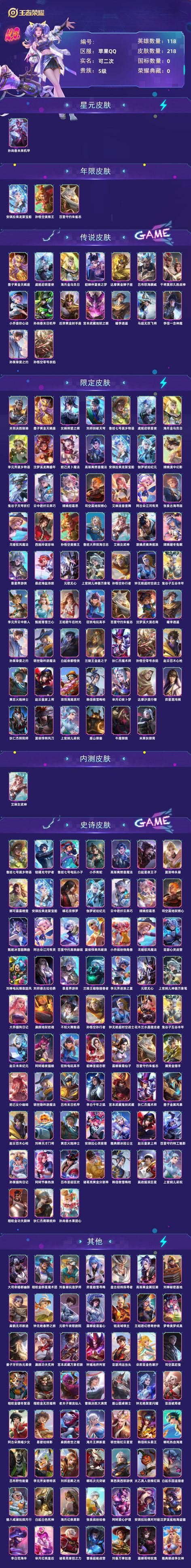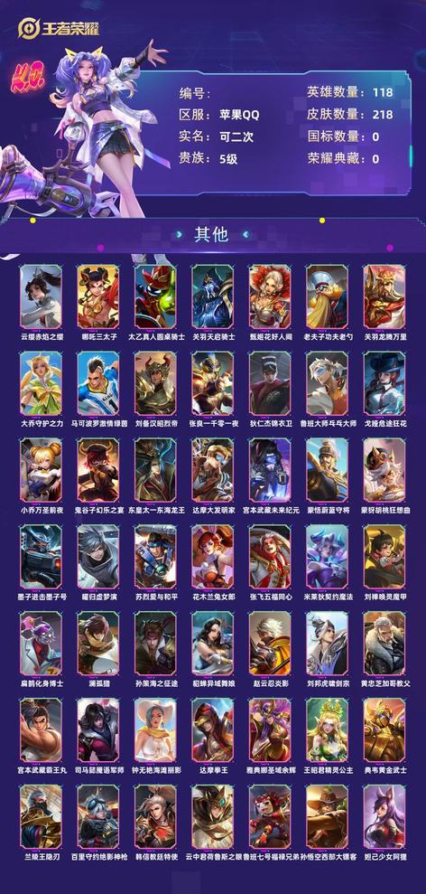 【6YISG1H1】典藏0 傳說16 史詩66 英雄118 造型218 貴族5級 造型價值:159904 可排位 【星元造型1】 孫尚香未來機甲 【年限造型3】 安琪拉乘龍聚寶船 孫悟空美猴王 百里守約朱雀志 【傳說造型16】 墨子黃金天蠍座 虞姬啟明星使 海月金烏負日 貂蟬仲夏夜之夢 達摩黃金獅子座 呂布怒海麟威 干將莫邪久勝戰神 小喬音你心動 孫尚香末日機甲 后羿黃金射手座 宮本武藏地獄之眼