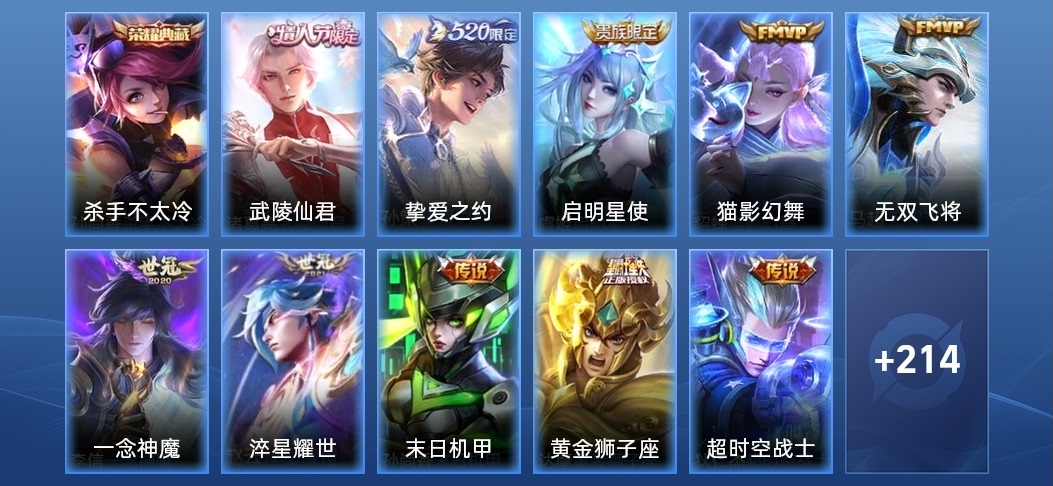 甄姬-冰雪圓舞曲,張良-古海尋蹤,明世隱-虹雲星官,鍾無豔-生化警戒,虞姬-加勒比小姐,白起-白色死神,豬八戒-潮玩探月行,明世隱-占星師,韓信-教廷特使,張良-繽紛繪卷,鬼谷子-阿摩司公爵,貂蟬-聖誕戀歌,姜子牙-時尚教父,劉禪-秘密基地,程咬金-無雙福將,劉備-潮玩造夢師,蒙恬-秩序獵龍將,司空震-啟蟄,小喬-萬聖前夜,花木蘭-兔女郎,張飛-亂世虎臣,墨子-進擊墨子號,不知火舞-魅語,大喬-伊勢巫女,蔡文姬-薔薇王座,瀾-孤獵,雲纓-赤焰之纓,宮本武藏-鬼劍武藏,劉禪-喚靈魔甲,米萊狄-契約魔法,夏洛特-永晝,沈夢溪-鯊炮海盜貓,劉邦-德古拉伯爵,桑啟-畫中遊,呂布-野性能量,廉頗-地獄巖魂,程咬金-功夫廚神,露娜-緋紅之刃,蘭陵王-隱刃,狂鐵-特工戰影,曹操-超能戰警,周瑜-海軍大將,李白-敏銳之力,甄姬-花好人間,橘右京-修羅,蒙犽-歸虛夢演,張良-一千零一夜,鬼谷子-幻樂之宴,妲己-女僕咖啡,安琪拉-時之奇旅,曜-歸虛夢演,元歌-午夜歌劇院,黃忠-芝加哥教父,司馬懿-魘語軍師,劉備-紐約教父,成吉思汗-維京掠奪者,阿軻-暗夜貓娘,劉禪-天才門將,張飛-五福同心,夏侯惇-乘風破浪,魯班大師-乓乓大師,孫尚香-水果甜心,鏡-冰刃幻境,西施-歸虛夢演,諸葛亮-黃金分割率,蘇烈-堅韌之力,安琪拉-心靈駭客,劉備-漢昭烈帝,楊戩-次元傲視,典韋-黃金武士,哪吒-次元突破,孫策-海之征途,亞瑟-心靈戰警,雅典娜-戰爭女神,楊戩-埃及法老,孫策-貓狗日記,伽羅-箭羽風息,墨子-金屬風暴,盾山-圓桌騎士,白起-星夜王子,安琪拉-玩偶對對碰,李元芳-逐浪之夏,阿軻-節奏熱浪,魯班七號-黑桃隊長,露娜-哥特玫瑰,貂蟬-異域舞娘,馬可波羅-激情綠茵,程咬金-星際陸戰隊,小喬-繽紛獨角獸,達摩-拳王,上官婉兒-修竹墨客,花木蘭-水晶獵龍者,馬超-倖存者,大喬-守護之力,狄仁傑-鷹眼統帥,孫臏-歸虛夢演,劉邦-聖殿之光,宮本武藏-霸王丸,妲己-魅力維加斯,關羽-龍騰萬里,蘇烈-愛與和平,后羿-阿爾法小隊,莊周-奇妙博物學,劉備-萬事如意,鍾馗-地府判官,孫尚香-沉穩之力,嫦娥-露花倒影,魯班七號-福祿兄弟,扁鵲-化身博士,米萊狄-精準探案法,鎧-曙光守護者,老夫子-功夫老勺,狂鐵-命運角鬥場,弈星-踏雪尋梅,王昭君-幻想奇妙夜,鍾無豔-海灘麗影,項羽-帝國元帥,曹操-死神來了,裴擒虎-街頭旋風,楊玉環-霓裳曲,李元芳-特種部隊,公孫離-花間舞,孫悟空-西部大鏢客,李白-千年之狐,阿軻-致命風華,夢奇-美夢成真,宮本武藏-永珍初新,羋月-紅桃皇后,高漸離-金屬狂潮,呂布-末日機甲,百里玄策-威尼斯狂歡,韓信-街頭霸王,王昭君-精靈公主,百里守約-絕影神槍,蘭陵王-暗隱獵獸者,劉禪-英喵野望,諸葛亮-星航指揮官,東皇太一-東海龍王,鎧-龍域領主,狄仁傑-錦衣衛,干將莫邪-第七人偶,老夫子-潮流仙人,妲己-少女阿狸