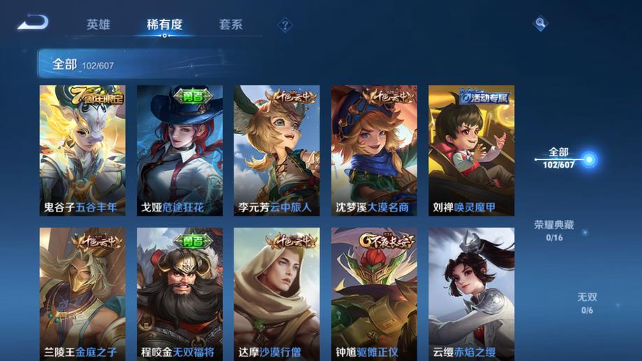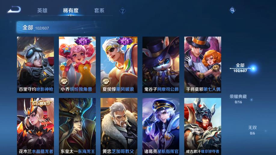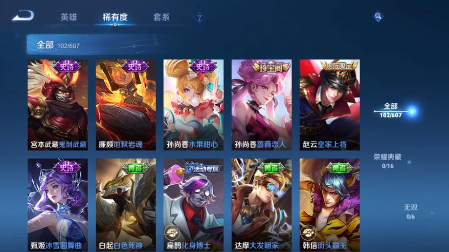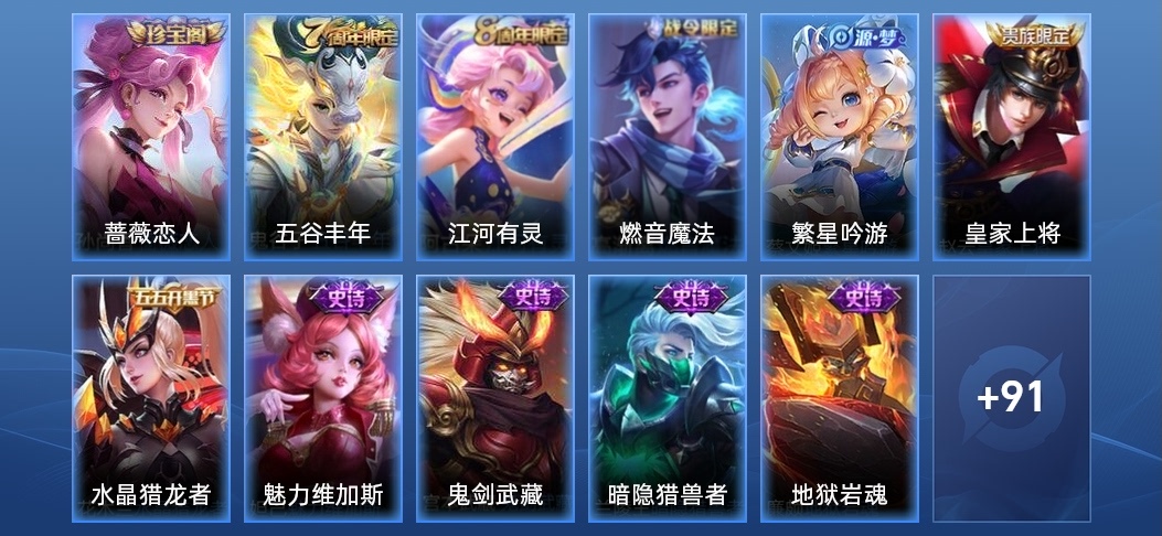 哪吒-次元突破,白起-白色死神,李元芳-妄想特派,瑤-森,蒙恬-秩序獵龍將,明世隱-占星師,夏侯惇-乘風破浪,虞姬-加勒比小姐,姜子牙-熾熱元素使,王昭君-幻想奇妙夜,鬼谷子-阿摩司公爵,成吉思汗-維京掠奪者,諸葛亮-掌控之力,鬼谷子-幻樂之宴,趙雲-忍·炎影,蘇烈-堅韌之力,李元芳-特種部隊,西施-歸虛夢演,雲纓-赤焰之纓,孫策-貓狗日記,高漸離-金屬狂潮,太乙真人-勁辣紅鍋,弈星-踏雪尋梅,花木蘭-水晶獵龍者,沈夢溪-鯊炮海盜貓,上官婉兒-修竹墨客,劉備-紐約教父,司馬懿-魘語軍師,甄姬-冰雪圓舞曲,東皇太一-東海龍王,魯班七號-木偶奇遇記,小喬-繽紛獨角獸,扁鵲-化身博士,明世隱-虹雲星官,亞連-破局者,瀾-孤獵,張良-古海尋蹤,李白-範海辛,廉頗-地獄巖魂,狂鐵-特工戰影,韓信-街頭霸王,豬八戒-潮玩探月行,呂布-野性能量,關羽-天啟騎士,諸葛亮-星航指揮官,蘭陵王-暗隱獵獸者,項羽-帝國元帥,伽羅-花見巫女,宮本武藏-永珍初新,戈婭-危途狂花,小喬-萬聖前夜,宮本武藏-鬼劍武藏,達摩-大發明家,程咬金-無雙福將,馬可波羅-激情綠茵,李信-灼熱之刃,貂蟬-異域舞娘,劉禪-喚靈魔甲,百里守約-絕影神槍,孫悟空-西部大鏢客,韓信-教廷特使,干將莫邪-第七人偶,孫尚香-沉穩之力,露娜-緋紅之刃,黃忠-芝加哥教父,孫尚香-水果甜心,楊玉環-霓裳曲,花木蘭-兔女郎,宮本武藏-霸王丸,后羿-精靈王,盾山-圓桌騎士,妲己-魅力維加斯,亞瑟-死亡騎士