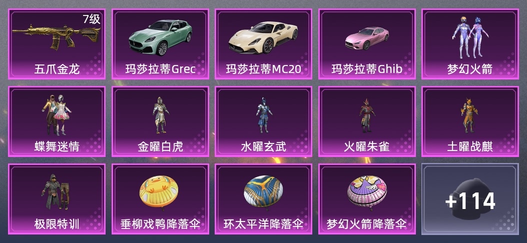 極限特訓降落傘,至尊龍雀降落傘,炫光之旅降落傘,幻影戰神降落傘,南瓜騎士降落傘,凝視深淵降落傘,夢幻火箭降落傘,環太平洋降落傘,垂柳戲鴨降落傘,至尊龍雀飛行服,夢幻火箭飛行器