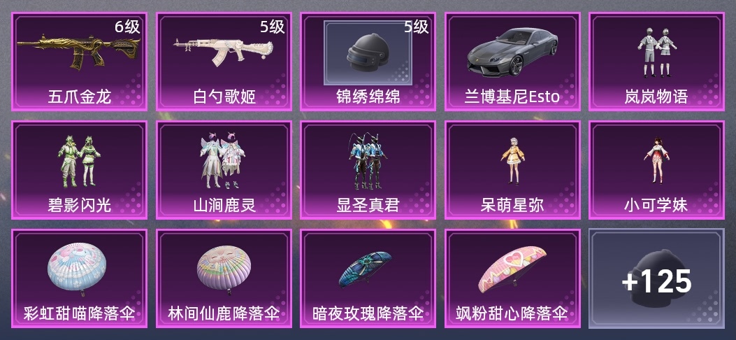 M416一把五爪金龍升到六級。AKM一把白芍歌姬升到5級,六套粉裝,一輛車皮