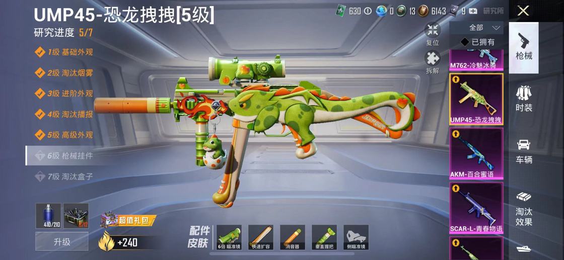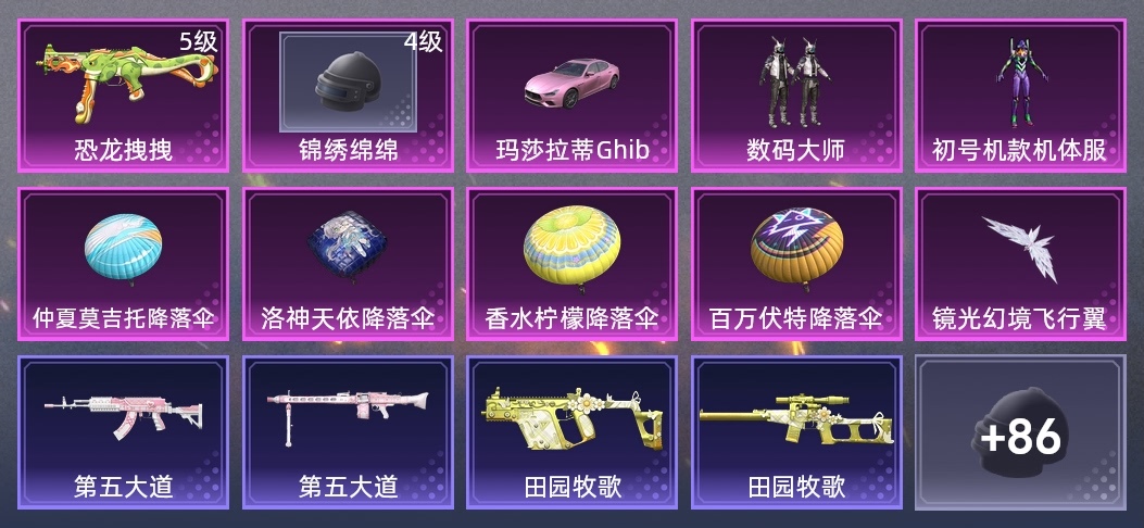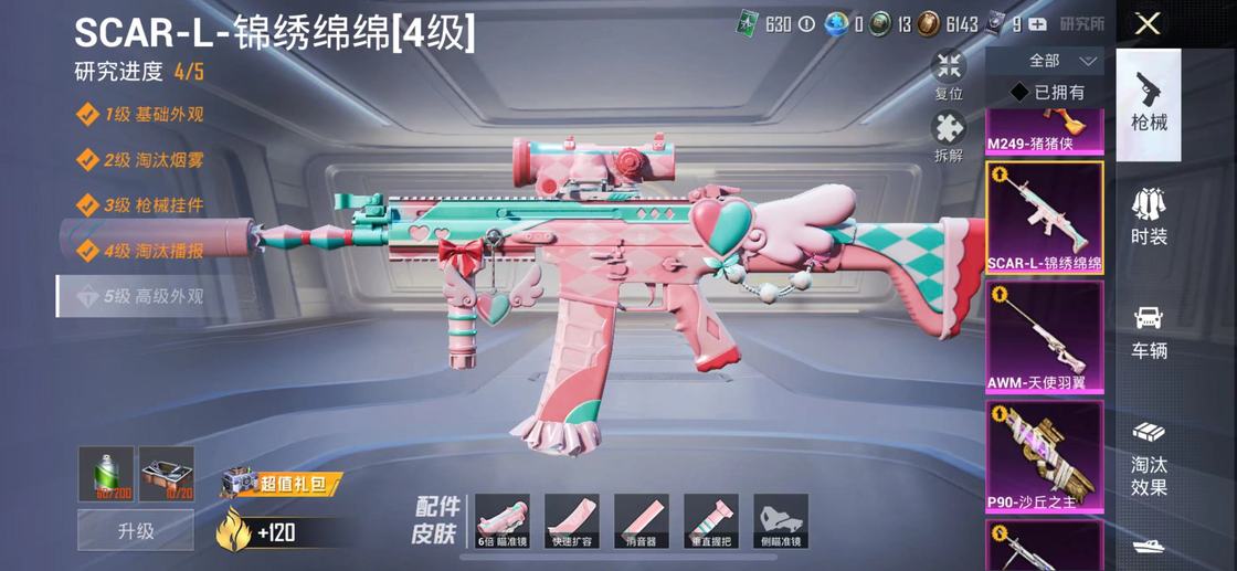 SCAR-L-錦繡綿綿,UMP45-恐龍拽拽,AKM-萌趣顏糰子,M16A4-蓮影清波,M416-神秘黑貓,M416-緋紅前夜,GROZA-治癒之星,GROZA-田園牧歌,GROZA-銀河戰甲,AUG-怪笑瘋兔,AUG-青春冒險家,AUG-耀粉歌者,AUG-輝耀戰甲,M762-第五大道,M762-緋紅前夜,M762-烈焰拳霸,Mk47-青春冒險家,G36C-時空追擊者,G36C-暗夜玫瑰,AC-VAL-快閃甜心,Kar98K-馬卡龍,M24-治癒之星,AWM-王牌四分衛,SKS-時空追擊者,VSS-星之彼岸,VSS-田園牧歌,Mini14-耀粉歌者,Mk14-治癒之星,QBU-青春冒險家,MK20-H-快閃甜心,UZI-魔法學院,UZI-古堡領主,UMP45-時空追擊者,Vector-治癒之星,Vector-香水檸檬,Vector-田園牧歌,湯姆遜-耀粉歌者,湯姆遜-銀刃賽羅,野牛-王牌四分衛,野牛-青春冒險家,P90-快閃甜心,S1897-百萬伏特,S1897-春暖花開,S12K-PEL轟鳴競夢者,DBS-時空追擊者,SPAS-12-田園牧歌,MG3-第五大道