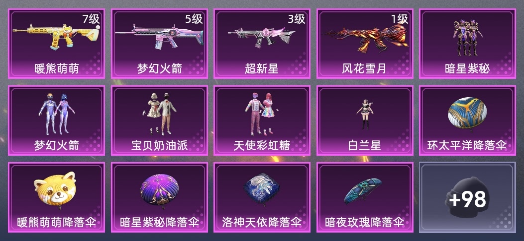 SCAR-L-夢幻火箭,M416-暖熊萌萌,M416-超新星,M416-風花雪月,AKM-環太平洋,M16A4-冥河戰士,M16A4-甜心亞夢,SCAR-L-暗夜玫瑰,M416-暗星紫秘,GROZA-異彩先驅,GROZA-影襲,QBZ-洛神天依,M762-瑞龍福將,M762-甜心寶貝,M762-奇異狩獵者,Mk47-炫光之旅,Mk47-妙紅點點,G36C-暗夜玫瑰,AC-VAL-甜心亞夢,蜜獾-嬌憨豬豬,Kar98K-夢幻火箭,Kar98K-藍莓炮彈,M24-影襲,AWM-焰鷹斗篷,Win94-瑞龍福將,AMR-妙紅點點,SKS-金玉無雙,Mini14-異彩先驅,Mk14-暗星紫秘,SLR-嬌憨豬豬,UZI-影襲,UZI-嬌憨豬豬,Vector-焰鷹斗篷,Vector-暗夜玫瑰,湯姆遜-環太平洋,湯姆遜-奇異狩獵者,湯姆遜-異彩先驅,野牛-電玩視界,MP5K-藍莓炮彈,MP5K-異彩先驅,S1897-碧影閃光,S12K-嬌憨豬豬,S12K-瑞龍福將,S12K-暖熊萌萌,DBS-甜心亞夢,DBS-焰鷹斗篷,DBS-暗星紫秘,M249-妙紅點點,DP-28-焰鷹斗篷,DP-28-甜心亞夢,MG3-妙紅點點,MG3-瑞龍福將