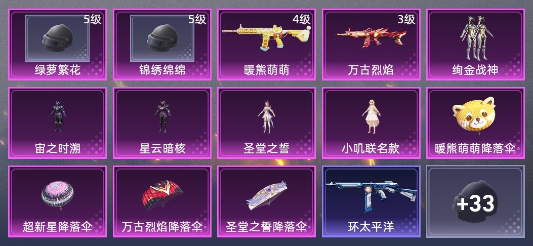 AKM-綠蘿繁花,SCAR-L-萬古烈焰,SCAR-L-錦繡綿綿,M416-暖熊萌萌,AKM-繽紛海域,M16A4-天使羽翼,M16A4-蓮影清波,M416-黃金獅王,M762-暖熊萌萌,AC-VAL-閒夢青纓,AC-VAL-快閃甜心,M200-驚鴻俠骨,SKS-迅猛狂鯊,Mini14-穿刺龍蝦,M417-驚鴻俠骨,MK20-H-快閃甜心,湯姆遜-環太平洋,P90-快閃甜心,S686-未來戰士,S12K-暖熊萌萌,MG3-驚鴻俠骨