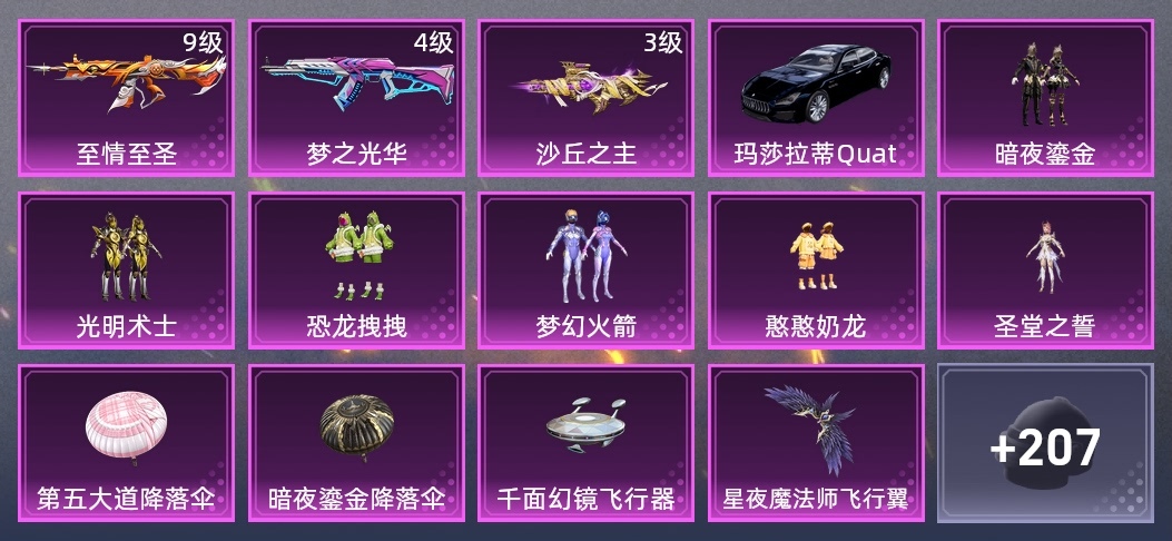 深海曼妙降落傘,甜心首席降落傘,神秘黑貓降落傘,聖堂之誓降落傘,百萬伏特降落傘,第五大道降落傘,沙丘之主降落傘,暗夜鎏金降落傘,星之彼岸降落傘,星夜魔法師飛行翼,千面幻鏡飛行器,黃族統領飛行器,勇闖險境飛行服,夢幻火箭飛行器