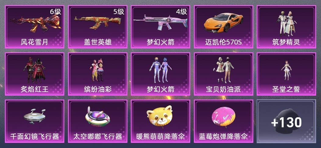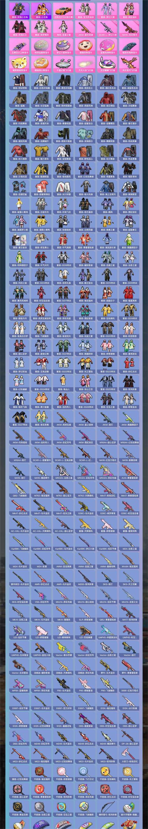 AKM-蓋世英雄,SCAR-L-夢幻火箭,M416-風花雪月,AKM-星之彼岸,AKM-萌趣顏糰子,M16A4-甜心亞夢,SCAR-L-甜蜜誓約,M416-紫翼聖騎,GROZA-治癒之星,GROZA-異彩先驅,AUG-青春冒險家,QBZ-飛馳魅影,M762-瑞龍福將,M762-甜心寶貝,Mk47-粉色回憶,Mk47-青春冒險家,Mk47-妙紅點點,Mk47-炫光之旅,G36C-綺夢青鸞,G36C-時空追擊者,AC-VAL-甜心亞夢,蜜獾-嬌憨豬豬,蜜獾-垂柳戲鴨,Kar98K-飛馳魅影,Kar98K-夢幻火箭,M24-治癒之星,M24-影襲,AWM-恐龍拽拽,AWM-聖堂之誓,AWM-垂柳戲鴨,Win94-瑞龍福將,AMR-妙紅點點,M200-驚鴻俠骨,SKS-天之羽翼,SKS-時空追擊者,Mini14-異彩先驅,Mini14-甜心娃娃,Mini14-龍宮之主,Mk14-治癒之星,Mk14-豬豬俠,SLR-嬌憨豬豬,QBU-青春冒險家,M417-驚鴻俠骨,UZI-嬌憨豬豬,UZI-烈焰拳霸,UMP45-仲夏莫吉托,UMP45-時空追擊者,Vector-香水檸檬,Vector-治癒之星,湯姆遜-耀粉歌者,湯姆遜-異彩先驅,野牛-青春冒險家,MP5K-藍莓炮彈,MP5K-異彩先驅,P90-飛馳魅影,S1897-百萬伏特,S1897-飛馳魅影,S12K-瑞龍福將,S12K-冰川粉黛,S12K-嬌憨豬豬,S12K-童趣迷兔,DBS-暗星紫秘,DBS-時空追擊者,DBS-甜心亞夢,M249-妙紅點點,DP-28-甜心亞夢,MG3-妙紅點點,MG3-瑞龍福將,MG3-驚鴻俠骨